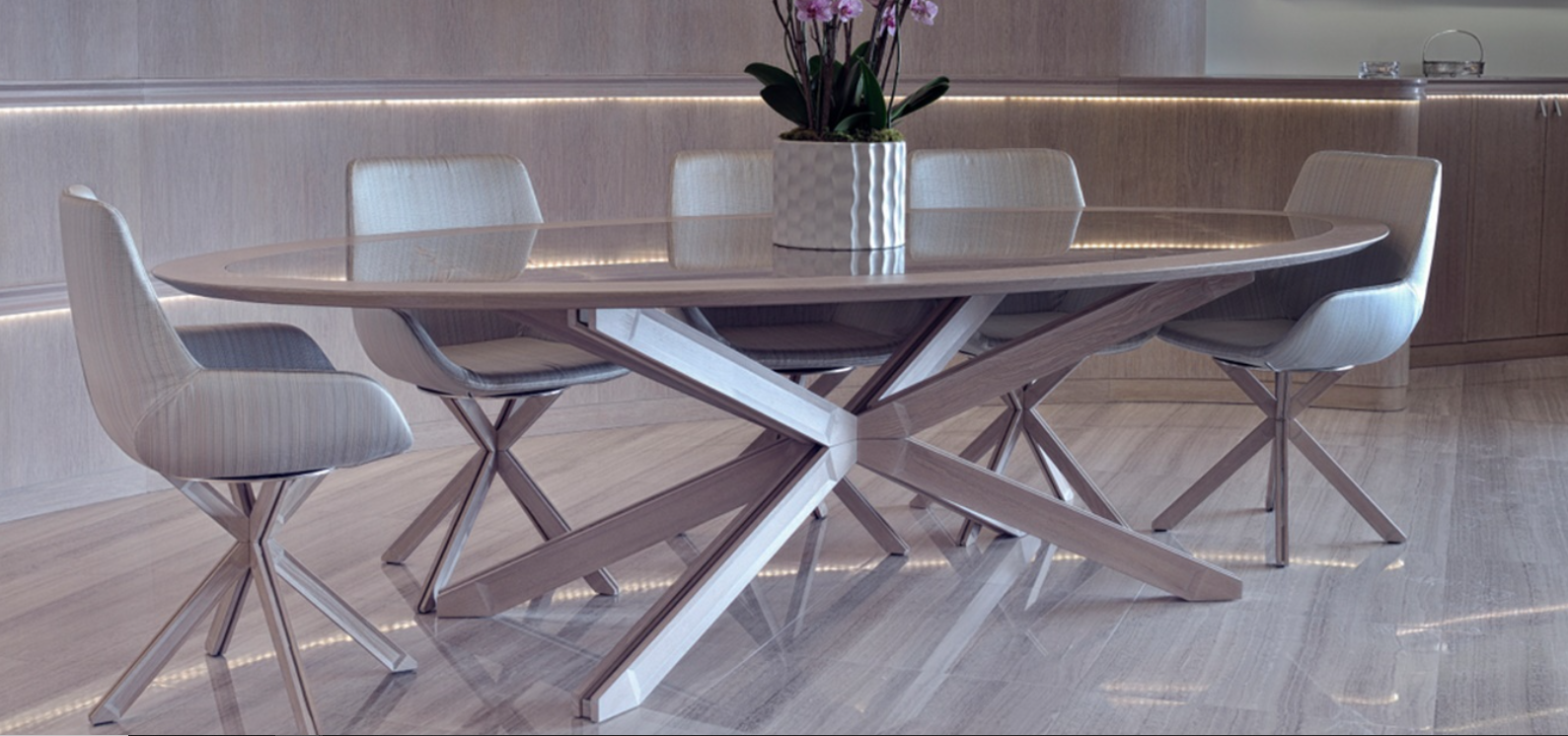 Овальный дубовый стол со стальным основанием, покрытым дубом.