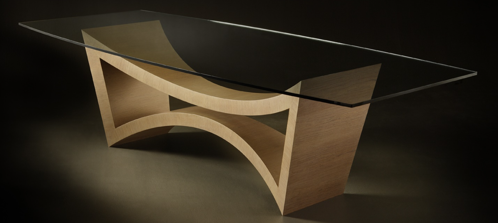 Стол со скульптурой из Ипе табако или эбенового дерева Макассар и столешницей из хрусталя.