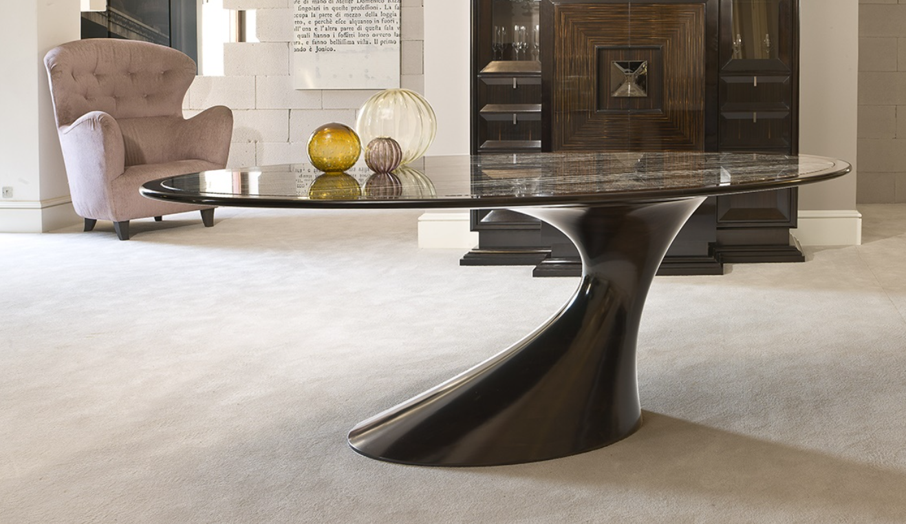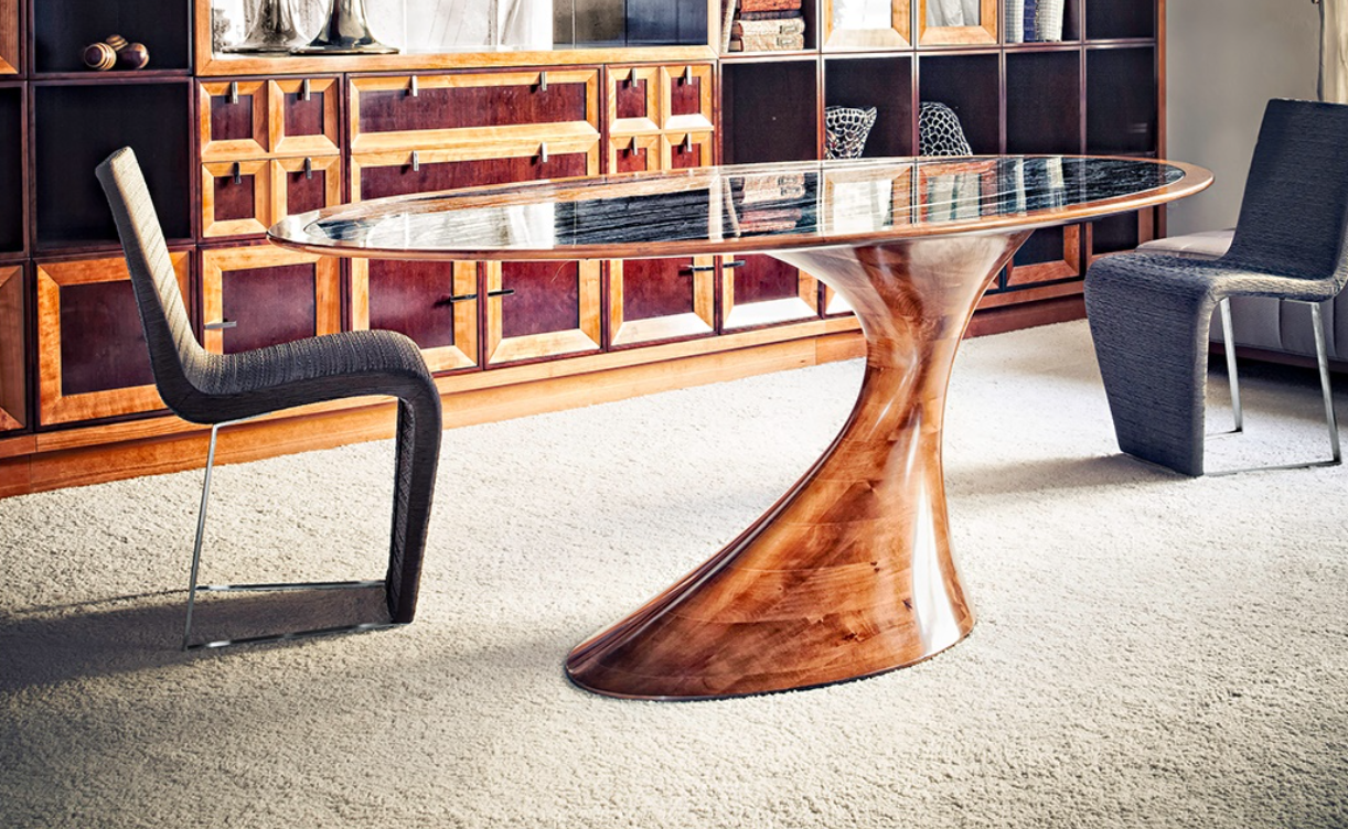 Овальный стол «Bend» с цельной деревянной подставкой, мраморной столешницей.