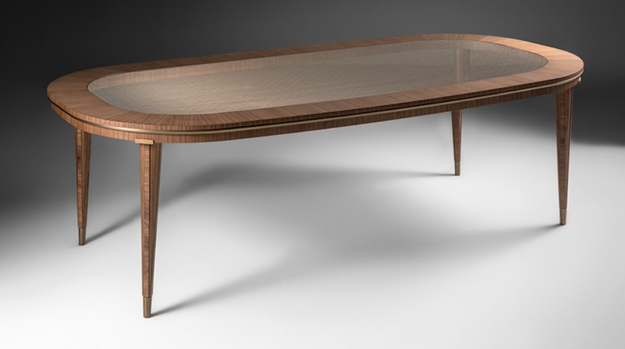 Стол Rodolfo из ореха Каналетто с элементами из литой бронзы и столешницей из двойного стекла, со встроенной металлической сеткой