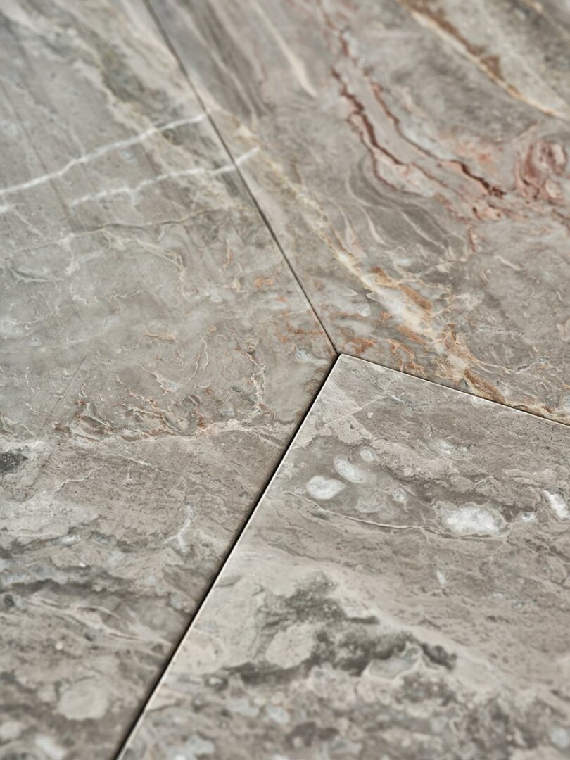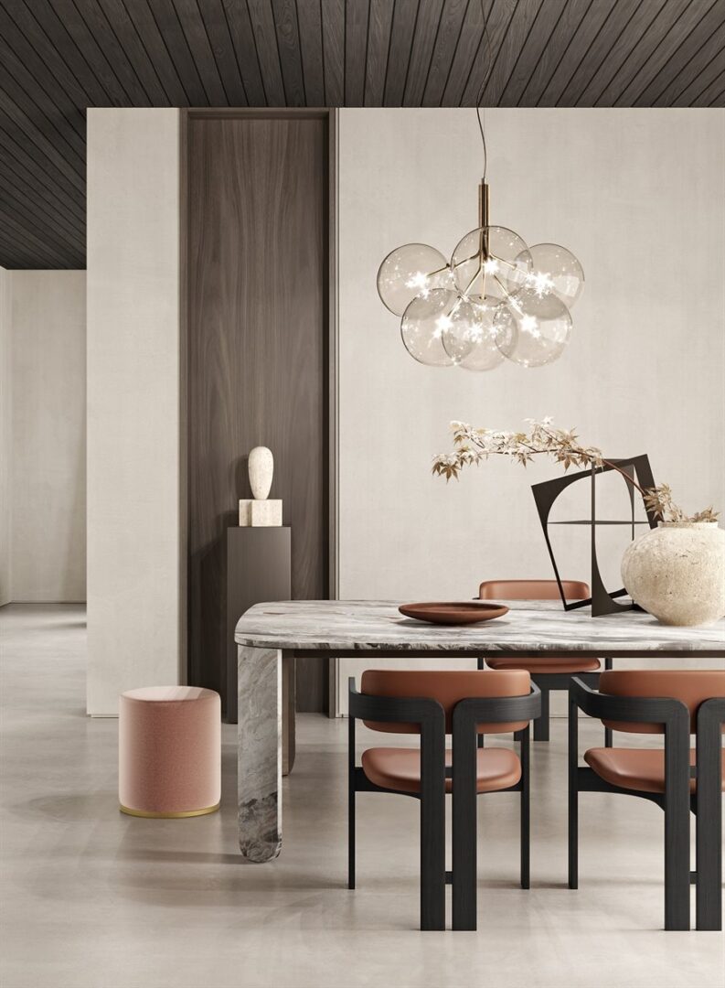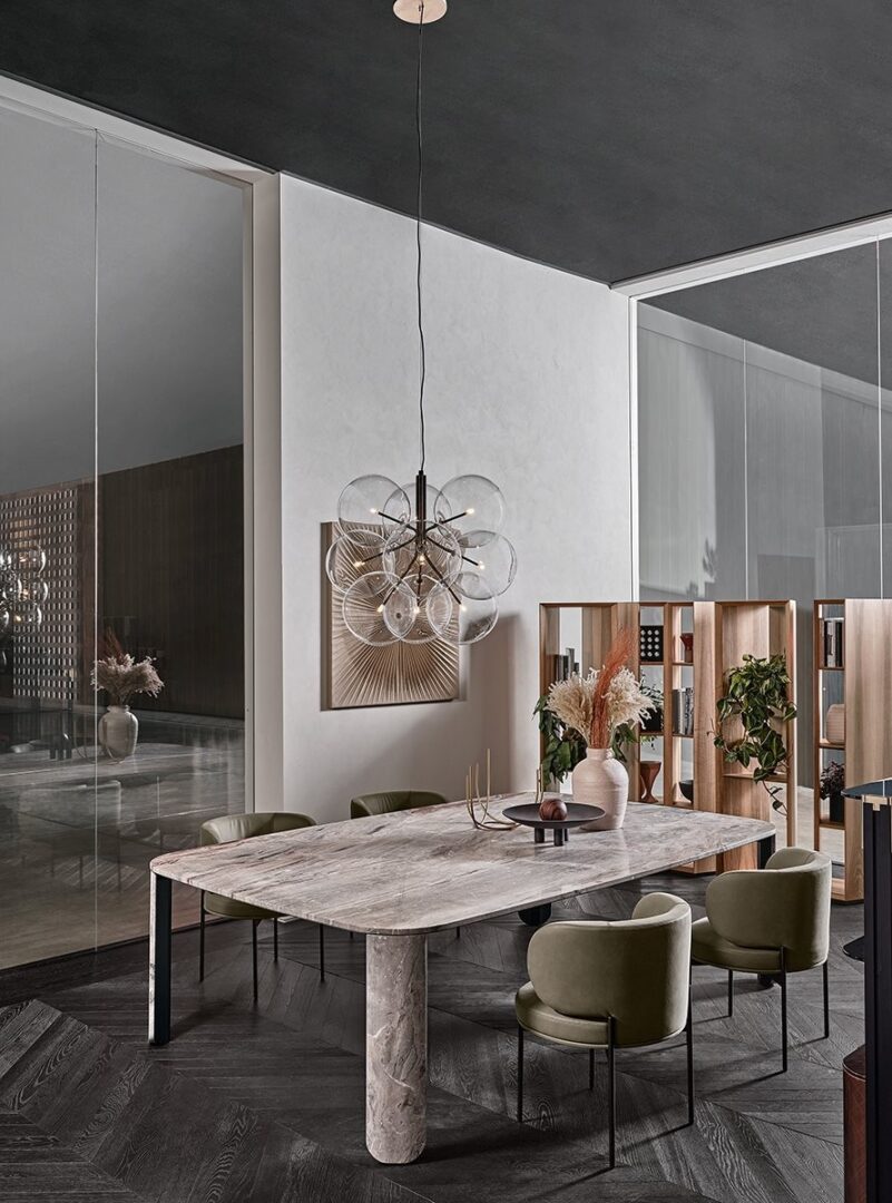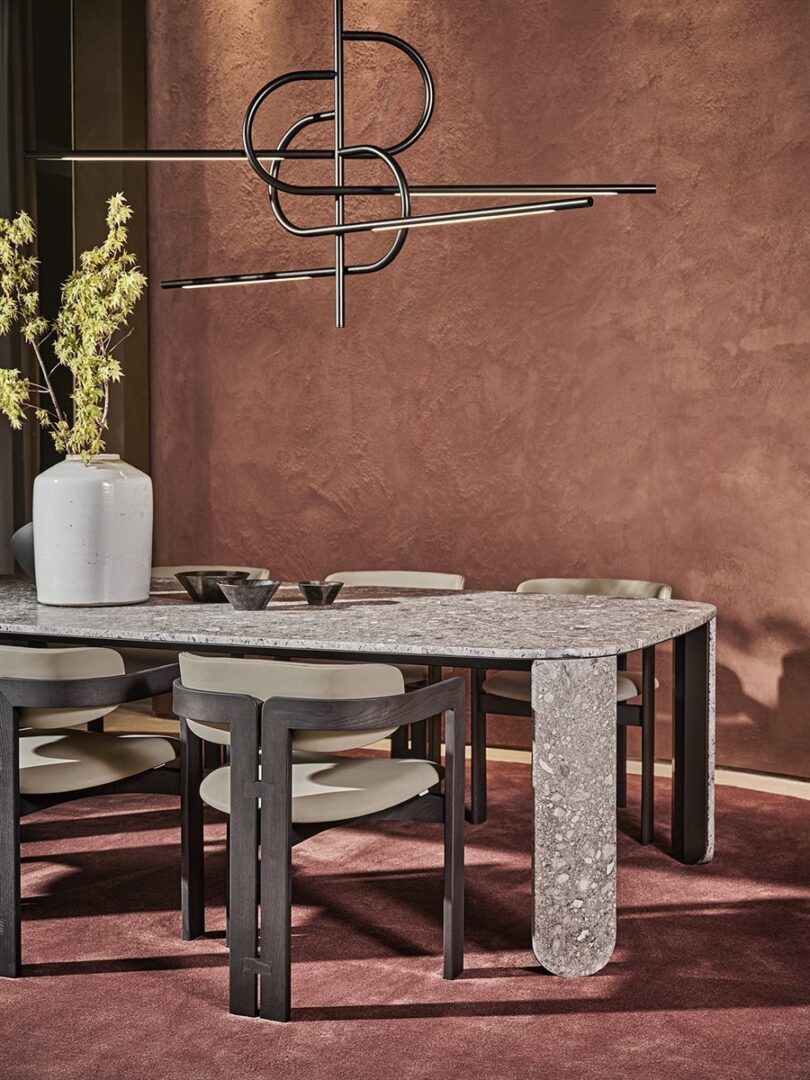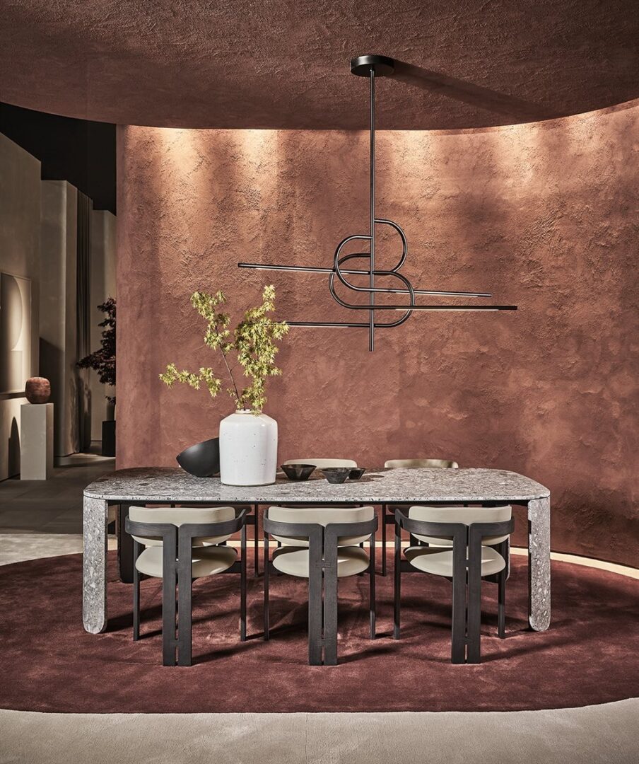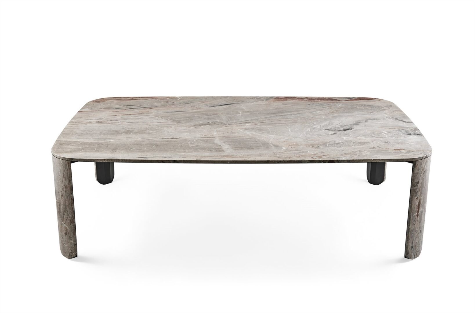 Стол из мрамора 20 мм Arabescato Orobico Rosso satinato, также доступен в матовом штамме Gré® или из белого мрамора Carrara Gioia satinato. Детали из полированного металла ручной работы «dark».