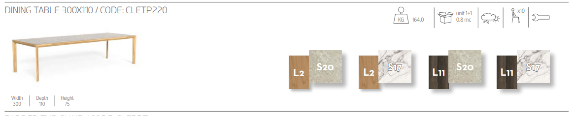 Прямоугольный обеденный стол размером 300×110 мм является самым большим и вместительным из линейки CleoSoft Wood. Он рассчитан на размещение до 10 человек и идеально подходит для проведения праздничных мероприятий в гостиной на открытом воздухе. Этот деревянный стол CleoSoft имеет деревянную конструкцию и столешницу из керамогранита, доступную в различных цветах.