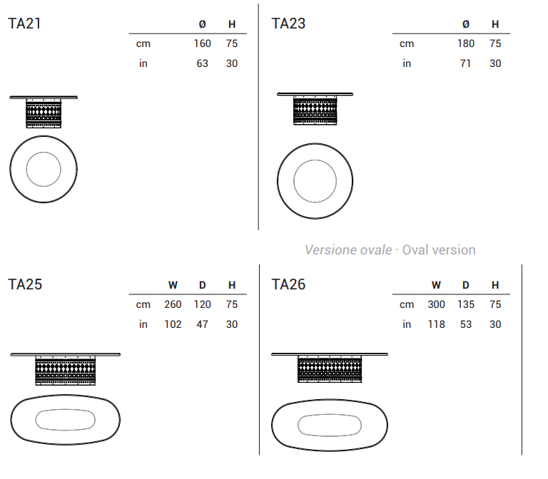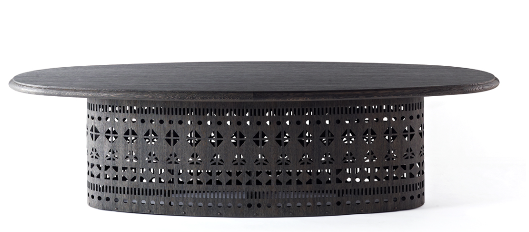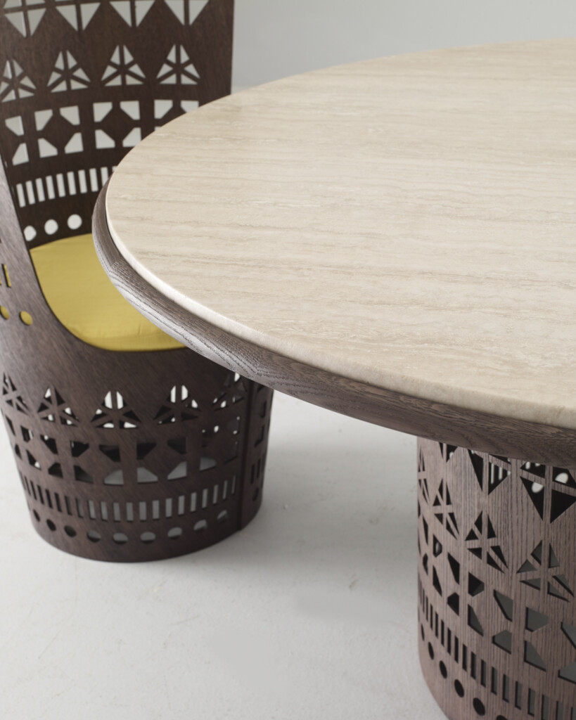 Серия столов, овальных или круглых, характеризующихся основанием, изготовленным из одного гибкого листа перфорированной фанеры, а затем обработанным вручную. Столешницы, выполненные из структурного контура из дерева, с закругленным краем из массива дуба, на который вставляется столешница из эссенции или мрамора.