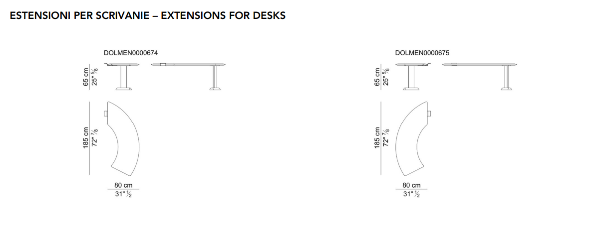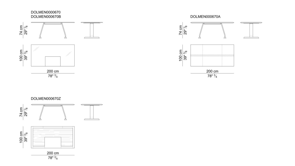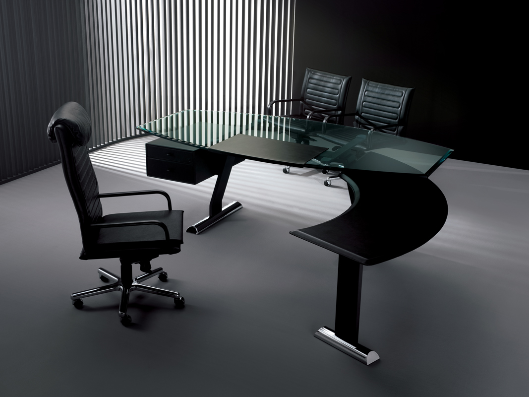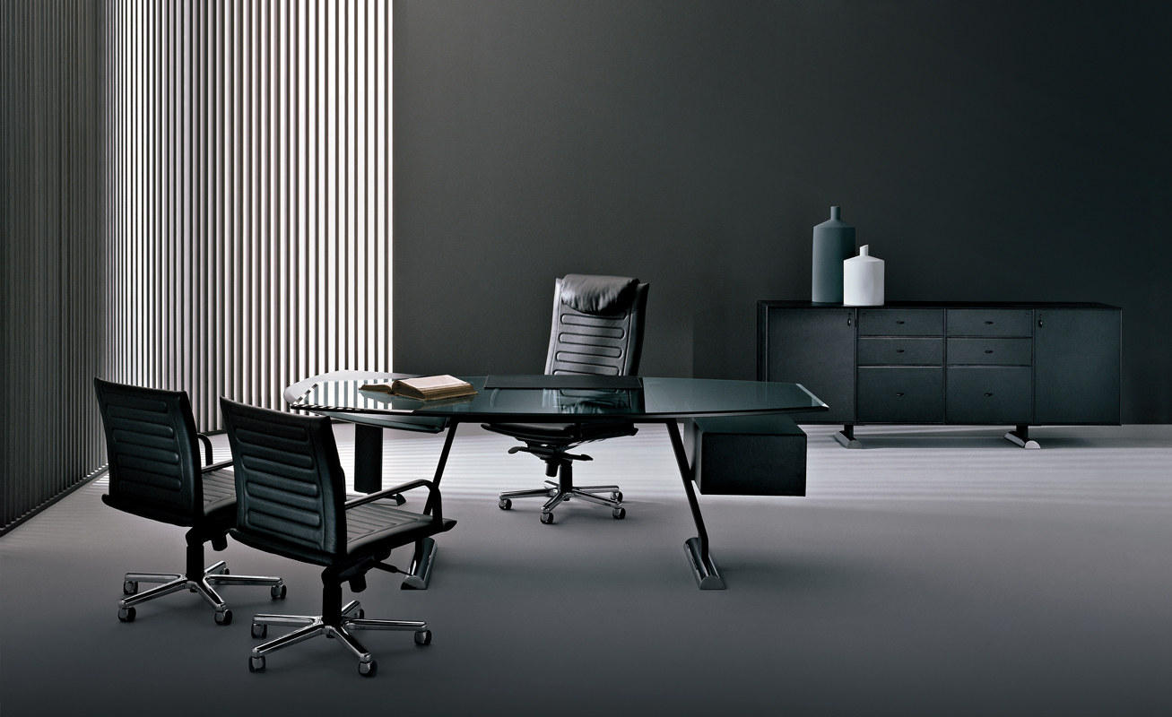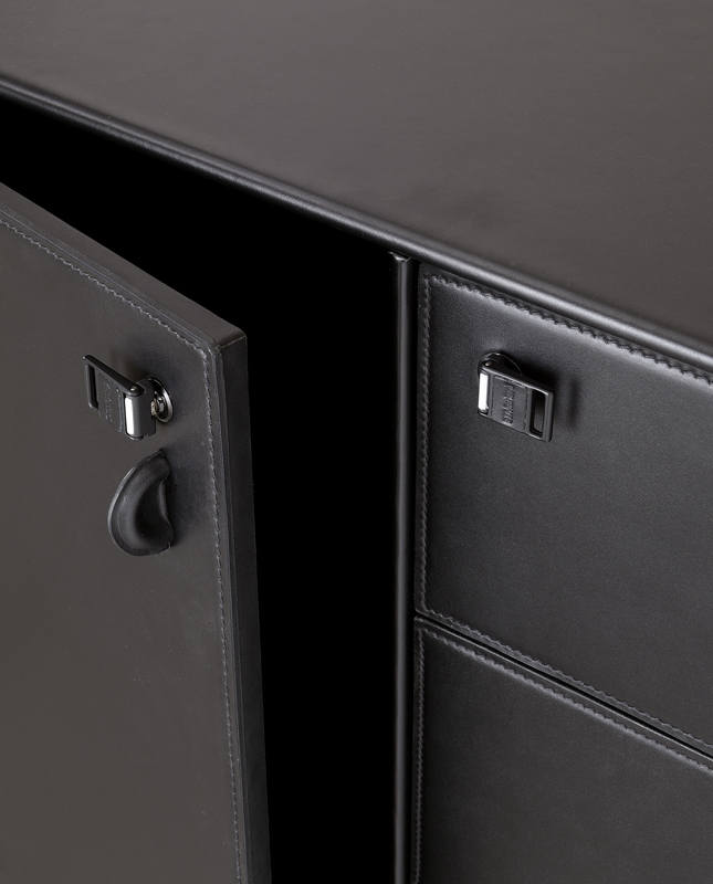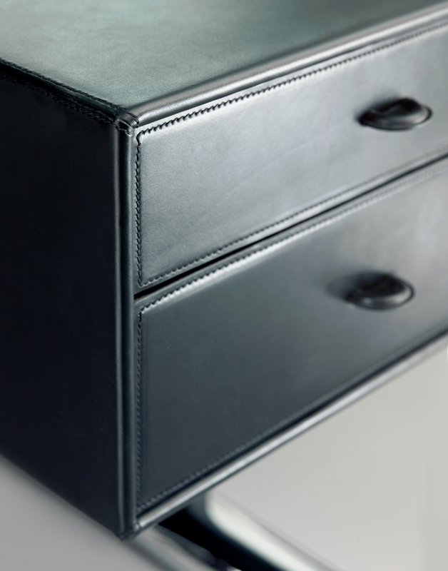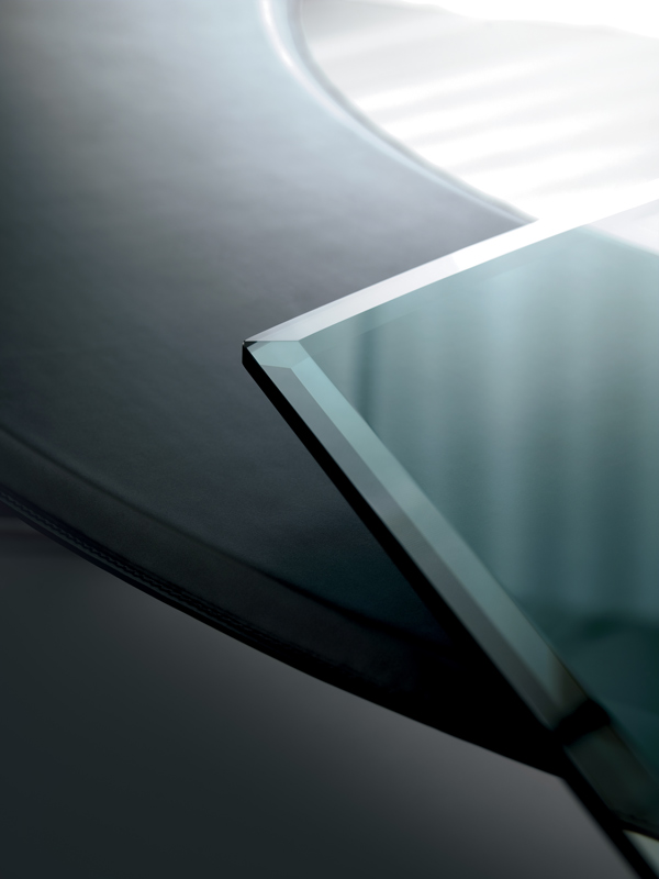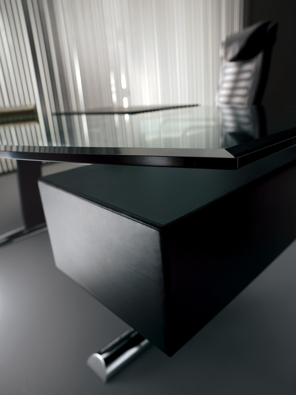 Столешница изготовлена из панели с черным меламиновым покрытием толщиной 36 мм, полностью обтянутой седельной кожей, или из панели из ДСП толщиной 36 мм, облицованной шпоном черного ореха в полоску с наружными краями, обтянутыми седельной кожей. Столешница также доступна с прозрачным стеклом со скошенной поверхностью толщиной 19 мм или с особо прозрачным закаленным стеклом со скошенной поверхностью, покрытым белым лаком толщиной 12 мм. Опоры столешниц имеют стальную раму, покрытую лаком серого антрацита, с двумя ножками из хромированной стали.