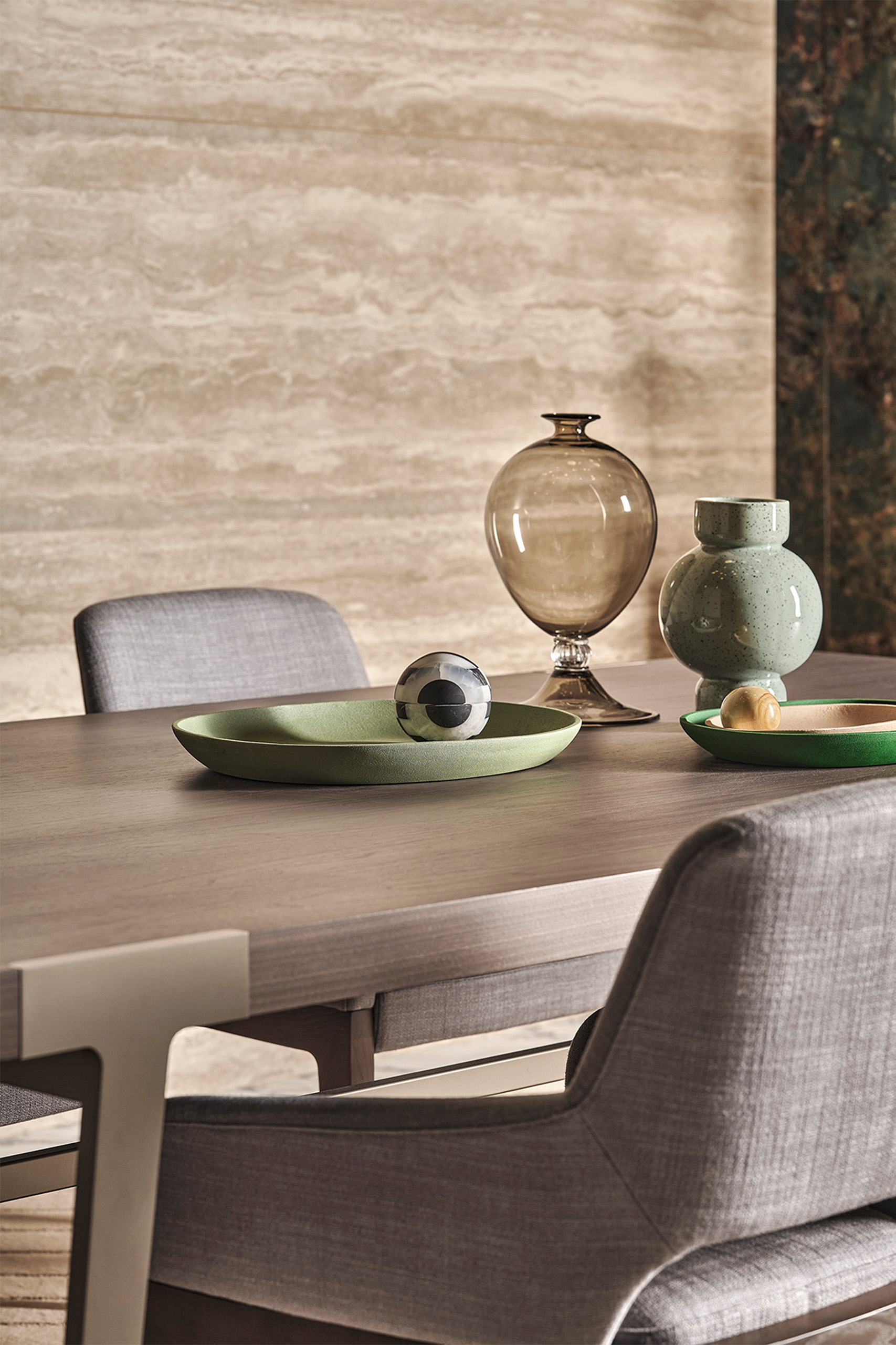Коллекция Domus сочетает в себе чистые линии современного дизайна с теплотой классических материалов. Прямоугольная столешница, выполненная из цельного дерева или дополненная мраморными вставками, выглядит монументально и в то же время изящно. Тонкие ножки из матового светло-платинового металла придают столу легкость, создавая эффект парящей конструкции. Такой дизайн идеально впишется как в просторные апартаменты, так и в камерные пространства, добавляя им респектабельности.
