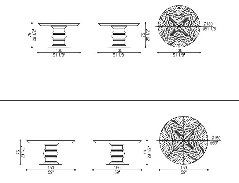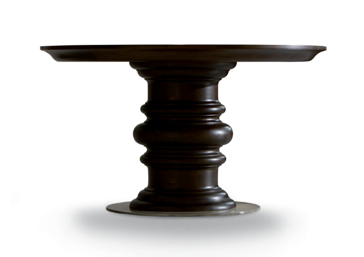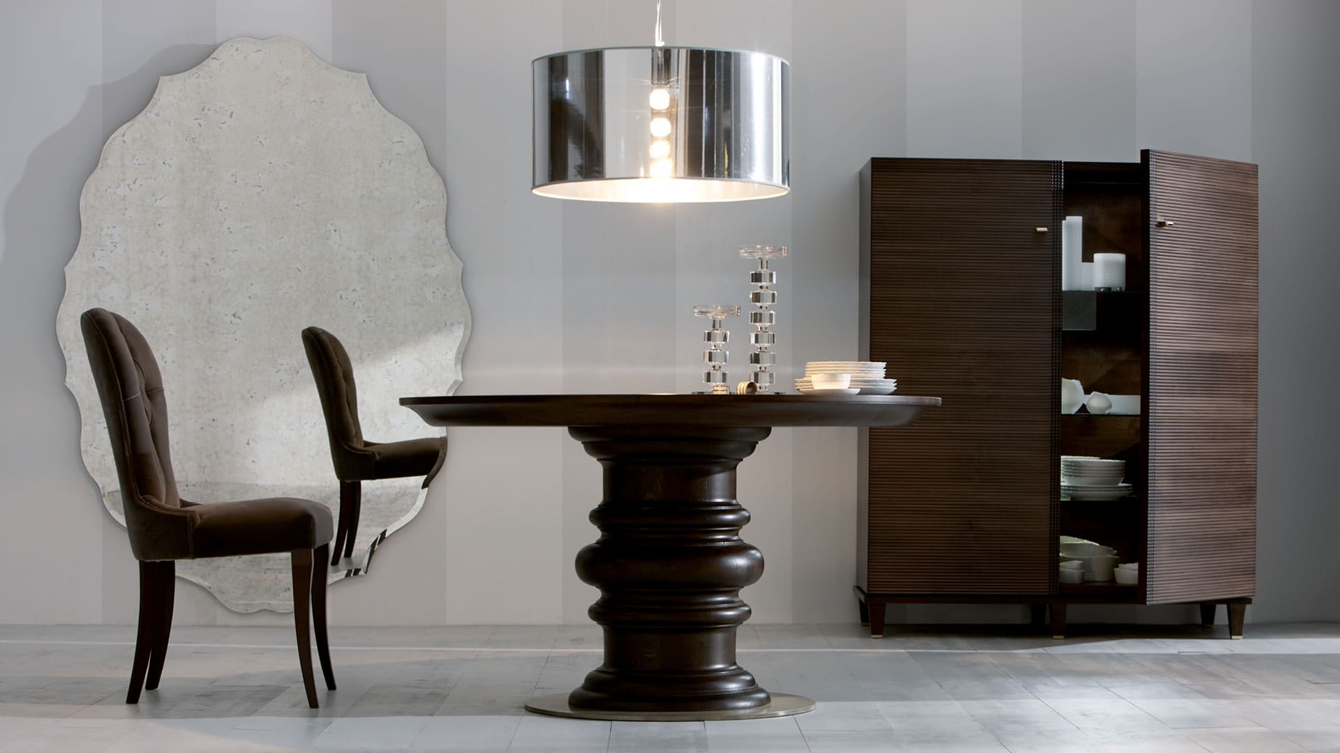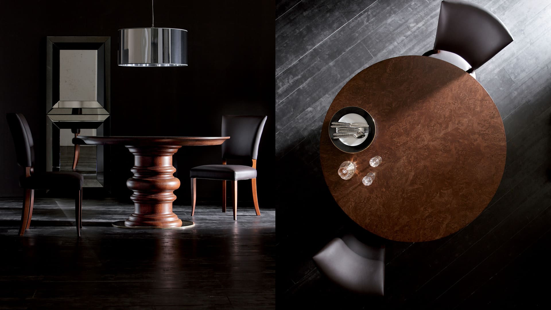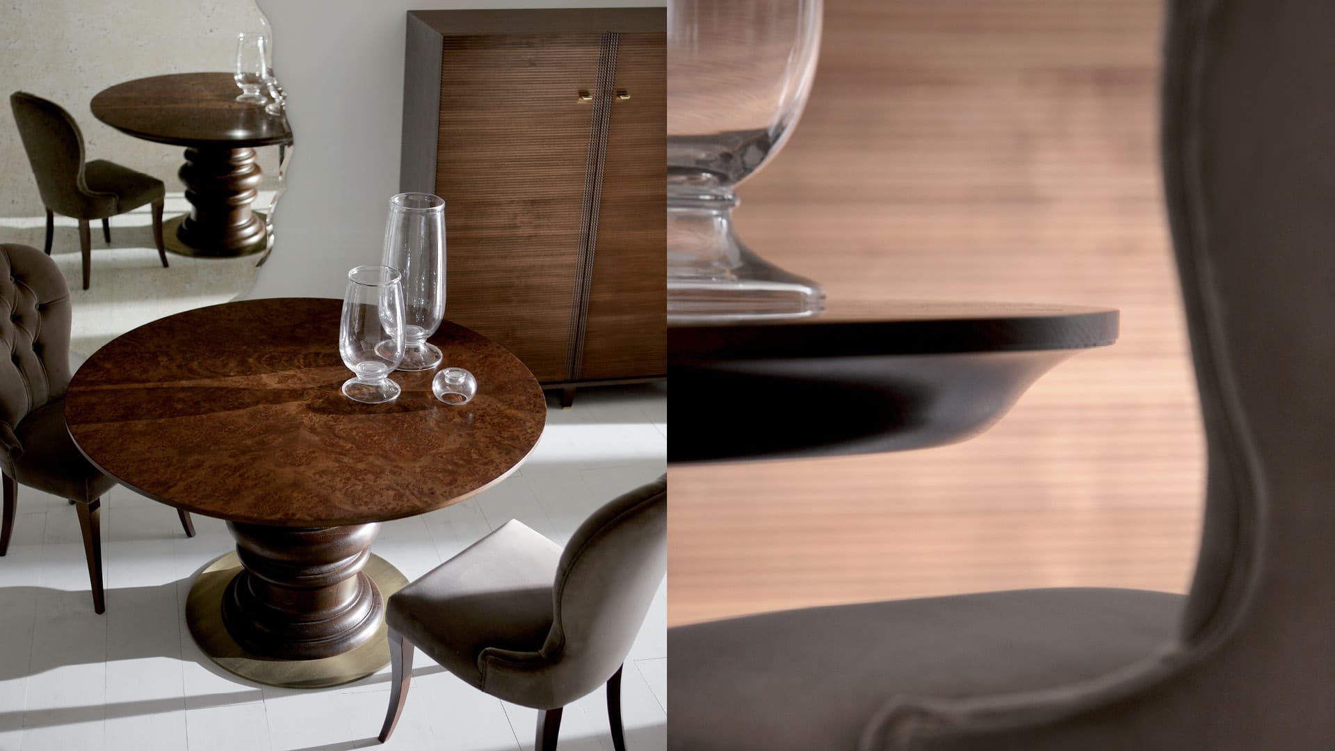 Круглый стол Edgar играет неоспоримую роль в оформлении столовой. Его основание, мастерски выполненное из цельного дерева, имеет элегантную форму и завершается изысканной металлической пластиной, которая усиливает его яркость за счет отражения света. Облицовка столешницы создает изысканную игру прожилок, придавая столу живость и изысканную привлекательность.