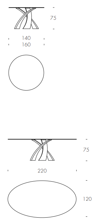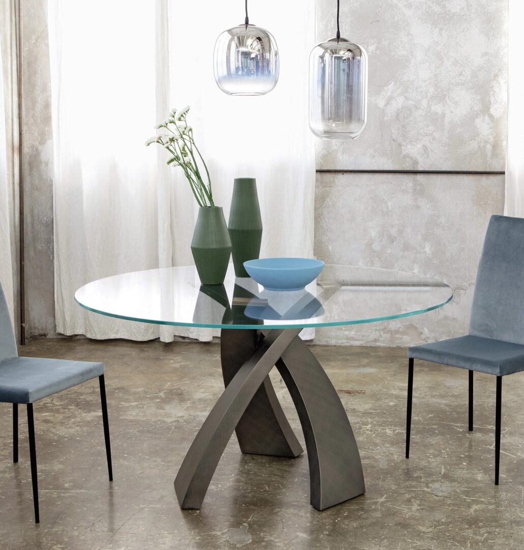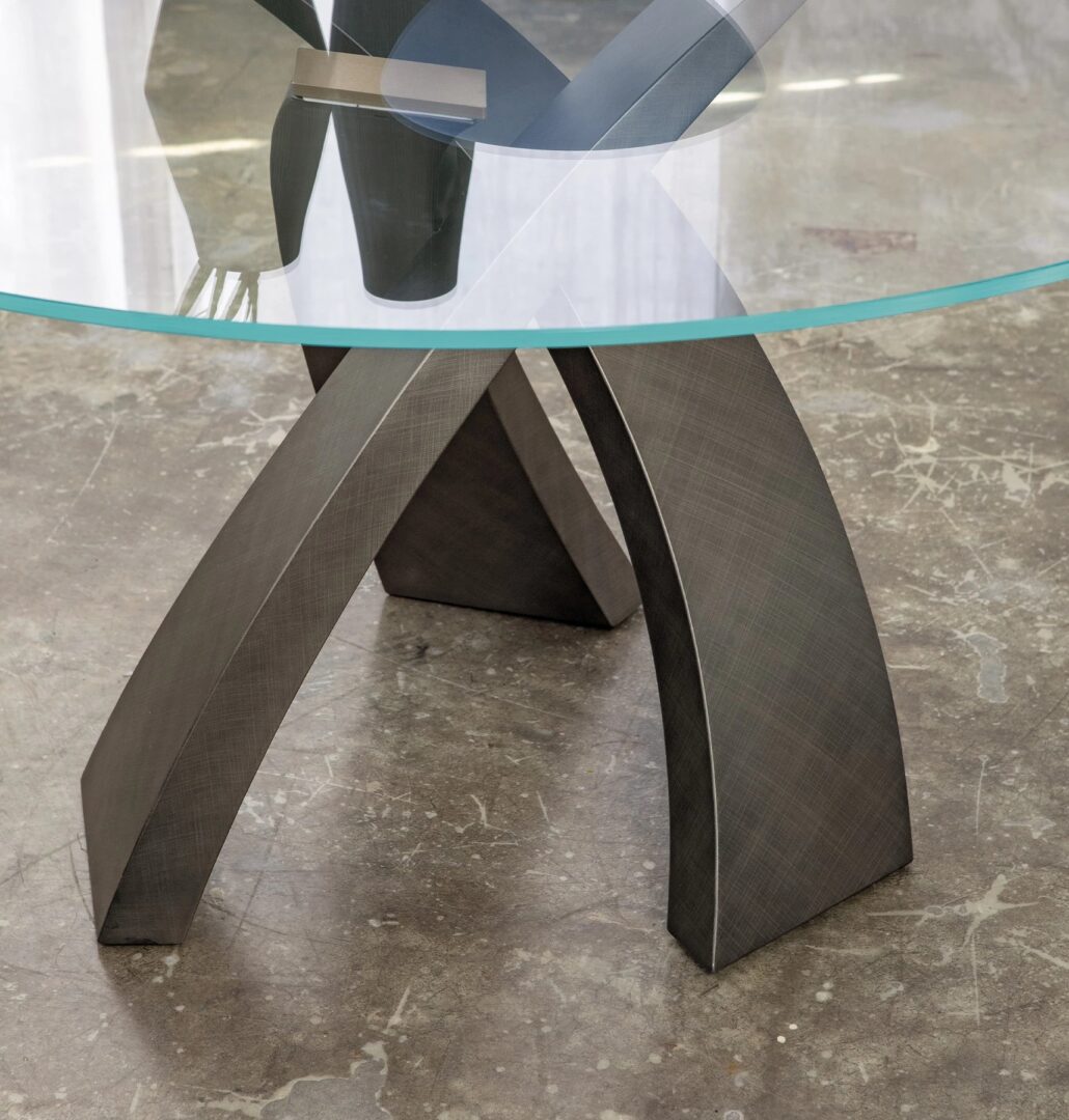 Новая отделка brushed для культового стола Eliseo, который подчеркивает переплетение основания благодаря изысканной отделке Brushed в Титановой и бронзовой версиях.