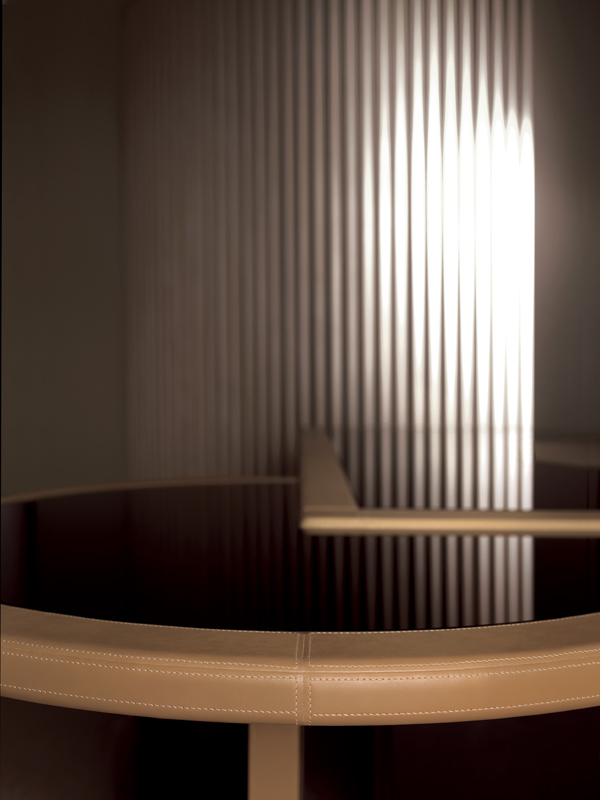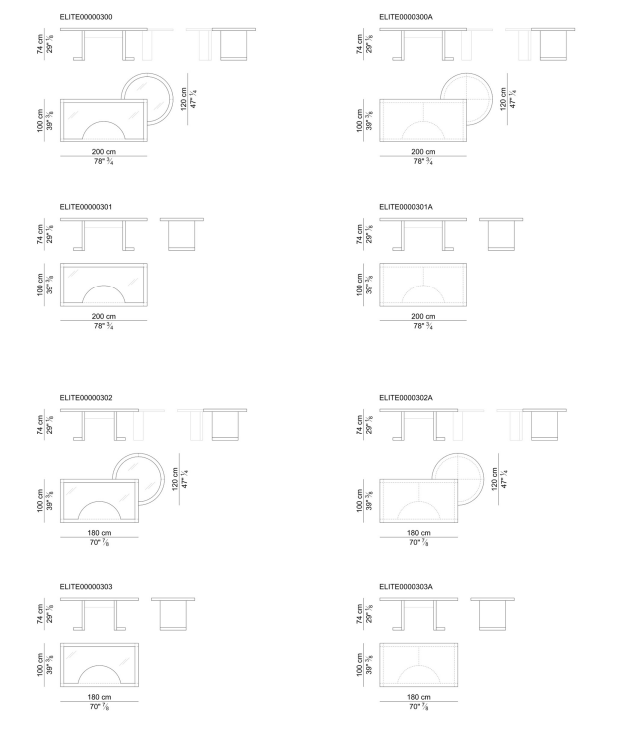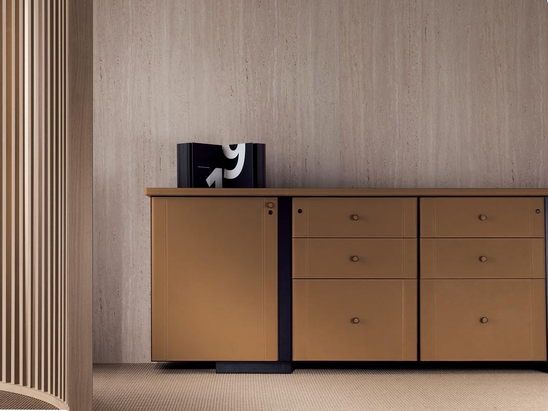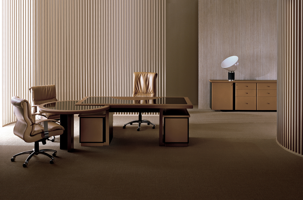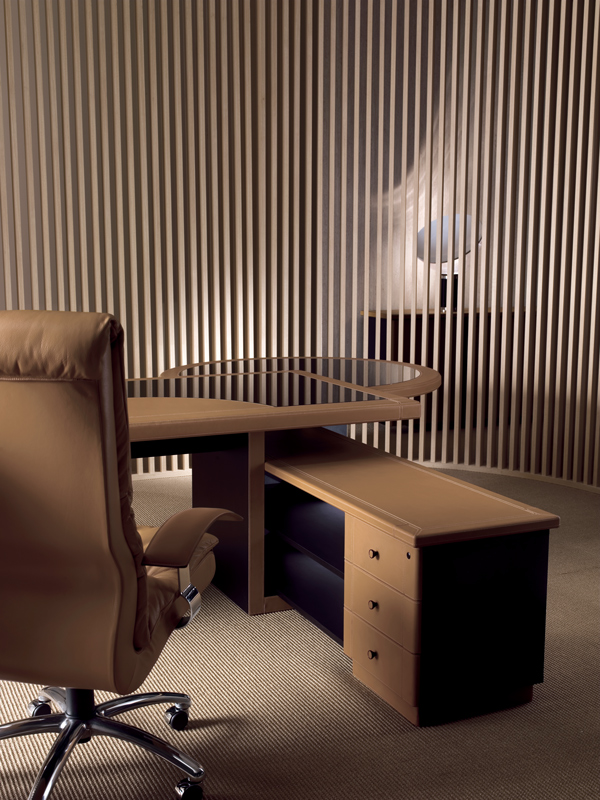 Столешницы и ножки письменных столов, а также элементы сборки шкафов изготовлены из сотовой древесноволокнистой плиты толщиной 58 мм, которая состоит из цельного каркаса из букового дерева, сотового картона толщиной 35 мм и двух панелей с черным меламиновым покрытием с двух сторон. Верх может быть полностью обтянут седельной кожей, либо с внешними краями, обтянутыми седельной кожей, и инкрустацией из черного лакированного стекла.