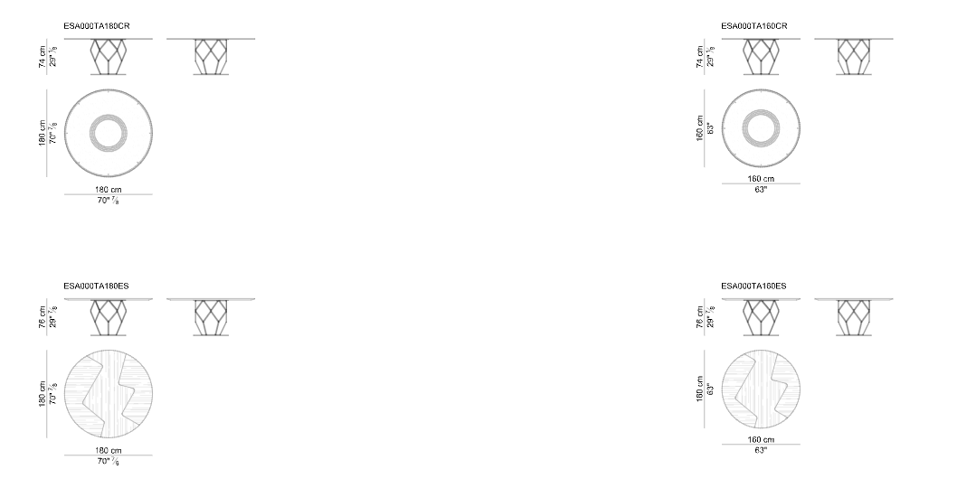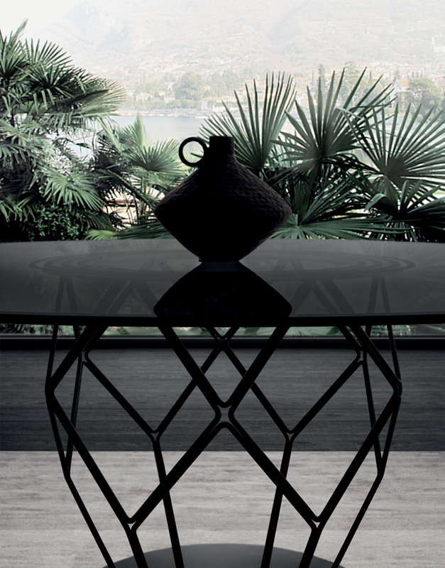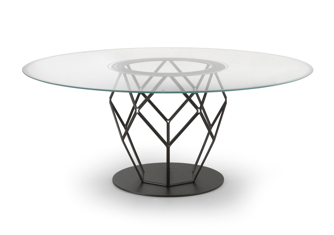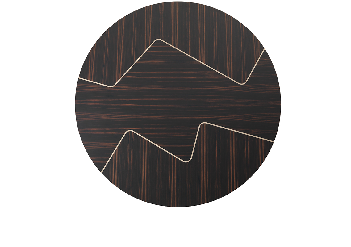 Круглый стол Esa, обладающий сильным визуальным эффектом, придает жилым помещениям функциональность и элегантность. Шестиугольные и пятиугольные геометрические фигуры, соединяясь вместе, оживляют стальное основание, выполненное в мельчайших деталях. Новые текстурированные металлические лаки придают отделке еще большую ценность. Столешница, доступная в двух размерах, предлагается из дымчатого стекла с рисунком, обработанным пескоструйной обработкой, или из шпона черного дерева Macassar с оригинальной вставкой из клена.