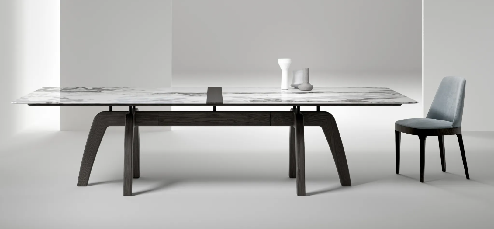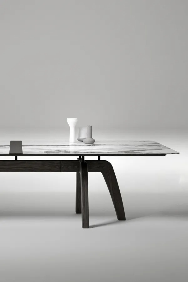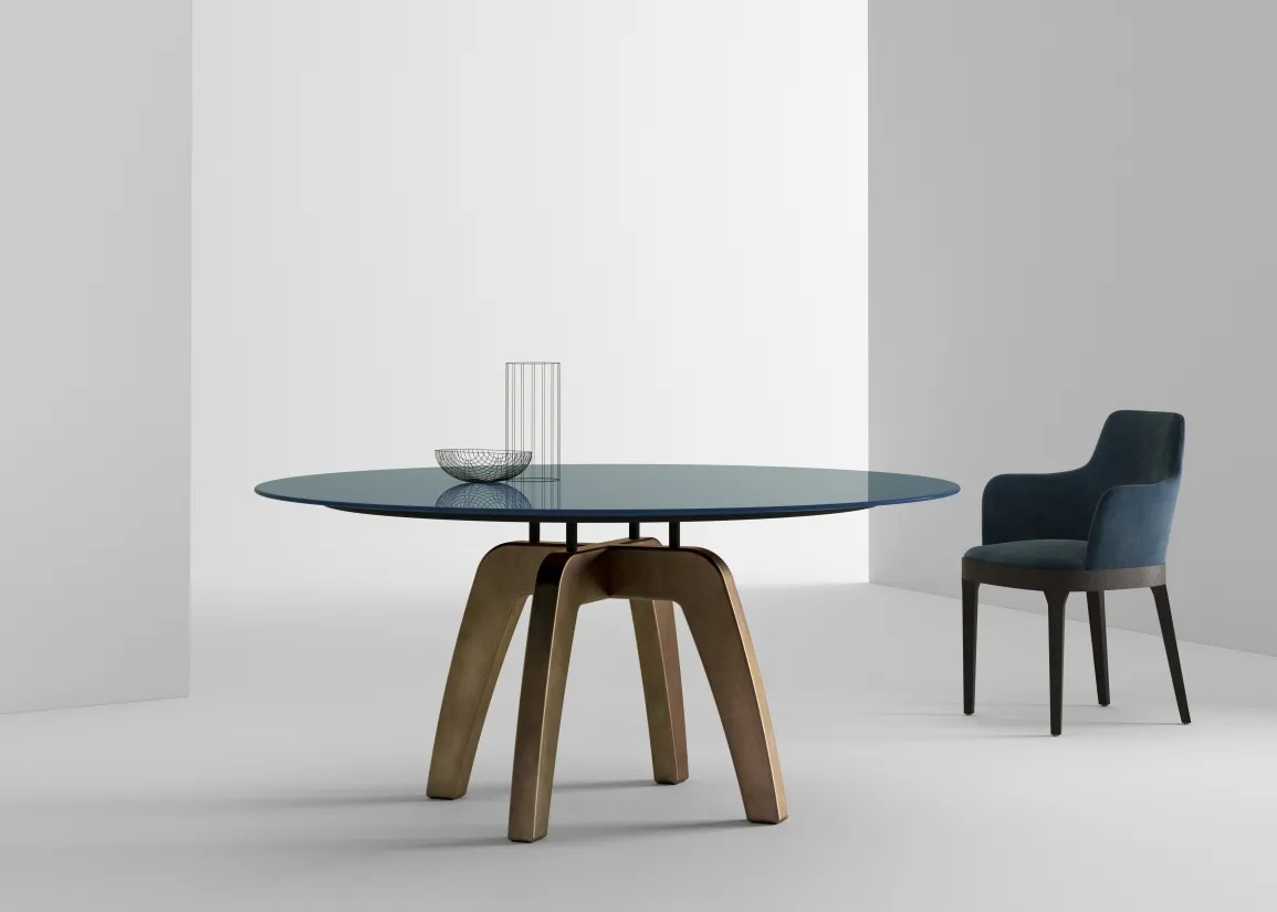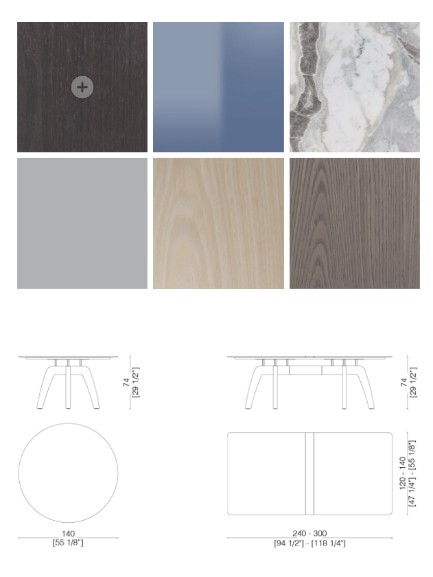 Круглый или прямоугольный стол доступен в разных размерах, со столешницей, украшенной вставкой из крашеного дерева.