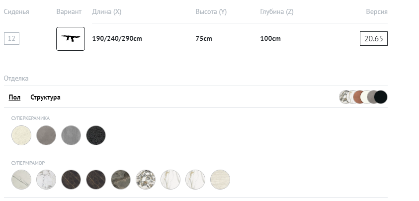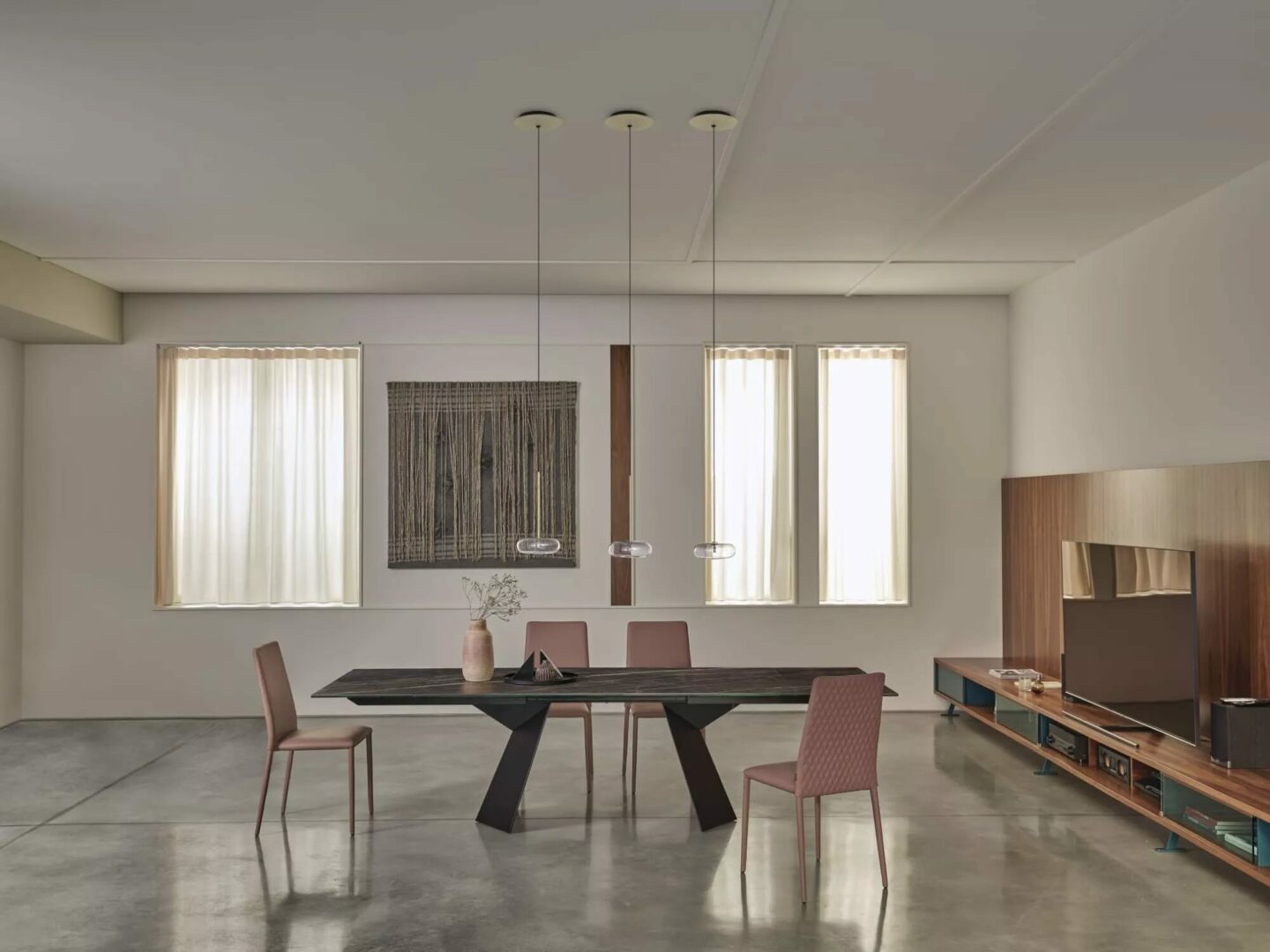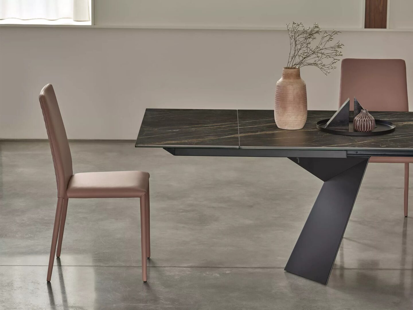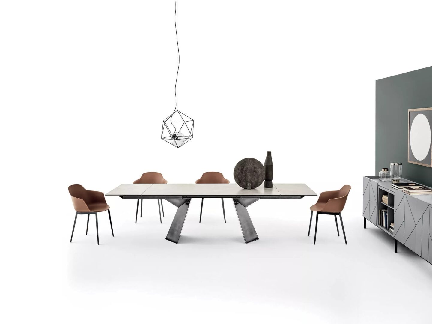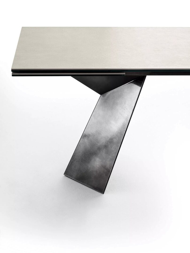 Стол раскладной со структурой из лакированной стали. Столешница из массива дерева, массива векового ореха, шпона с краями из массива, шпона, стекла, стекла, устойчивого к царапинам, СуперКерамики, СуперМрамора и натурального мрамора.
