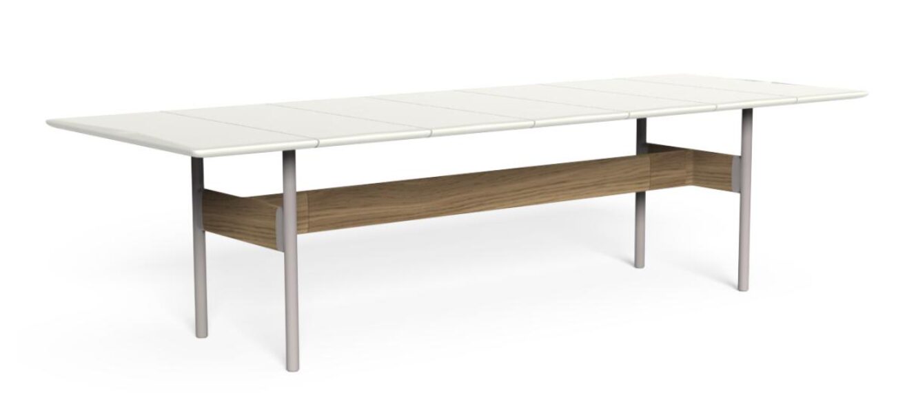 Просторный и впечатляющий прямоугольный обеденный стол является главным украшением праздничного стола на открытом воздухе. Его алюминиевая конструкция, выполненная в изысканных тонах, сочетается с элементами из тикового дерева, создавая естественный и гармоничный контраст. Столешница, выполненная из крупных планок из глазурованного керамогранита молочно-белого или оливково-зеленого цвета, идеально подходит для приема многочисленных гостей, сочетая функциональность и элегантность с важным, но в то же время утонченным дизайном. Благодаря своему оформлению обеденная зона превращается в универсальное, изысканное пространство, подходящее для любого случая.