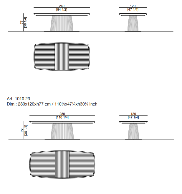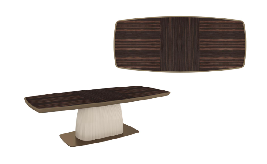 Стол Flute отличается скульптурной выразительностью и безупречными пропорциями. Его прямоугольная столешница с инкрустированной поверхностью и рифлеными опорами создает эффект легкости, несмотря на монументальность. Фирменная деталь — изысканная нубуковая окантовка, подчеркивающая статусность мебели. Доступны версии с одной или двумя центральными стойками, а также круглый вариант для более камерных пространств.