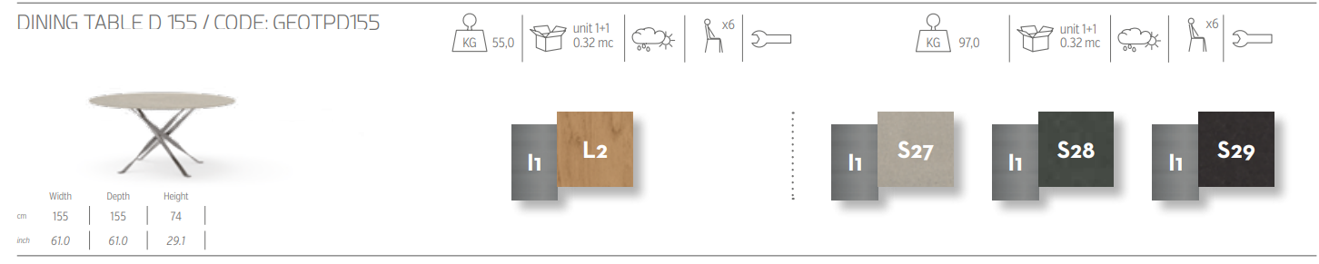 Обеденный стол D155 — единственный круглый стол в коллекции George. За большой и функциональной столешницей могут с комфортом разместиться до 6 человек. Столешница изготовлена из двух различных материалов: дерева аккойя или лавового камня, что делает ее уникальной в своем роде.