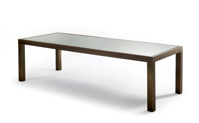 Прямоугольный обеденный стол с металлическим каркасом с бронзовой отделкой и бронзовой зеркальной столешницей. Кажущаяся простота стола Юпитера становится настоящей красотой и скрывает его большую сложность дизайна и производства.