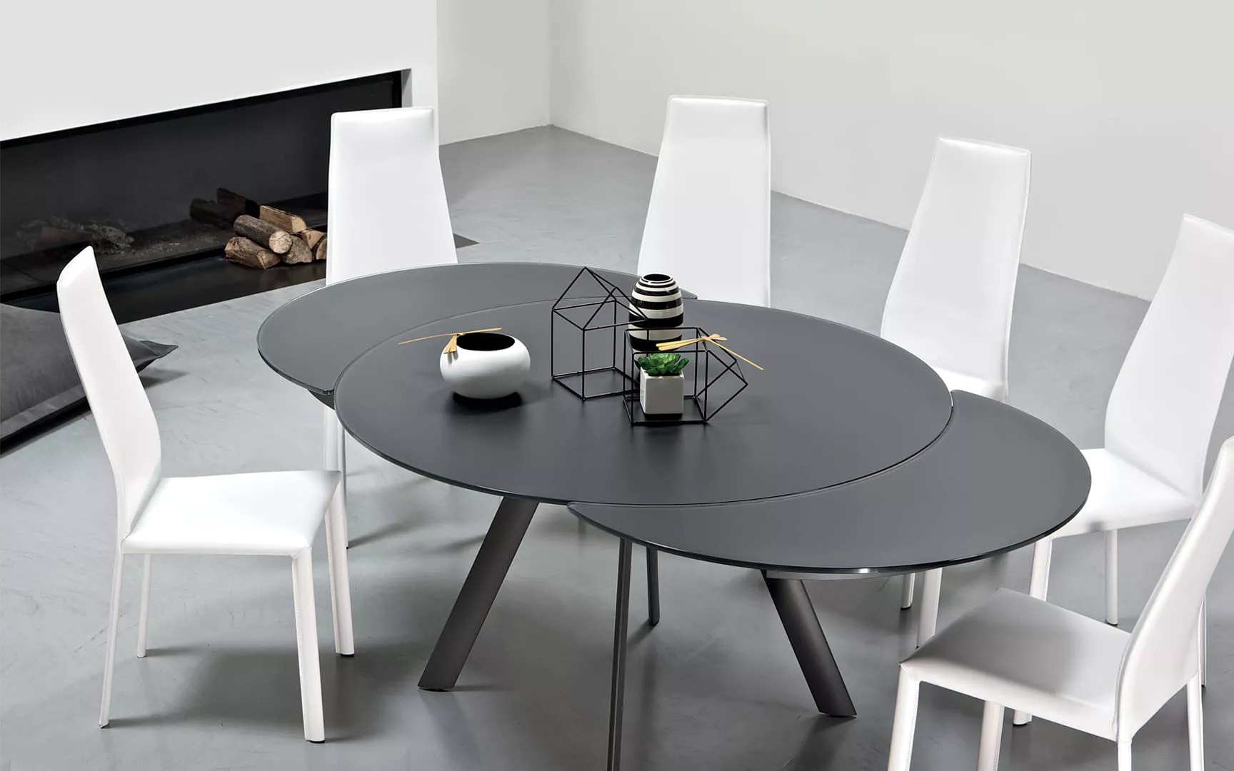Стол круглый раскладной, синхронный телескопический механизм открытия, структура из лакированной стали или нержавеющей стали. Столешница из стекла и стекла, устойчивого к царапинам.