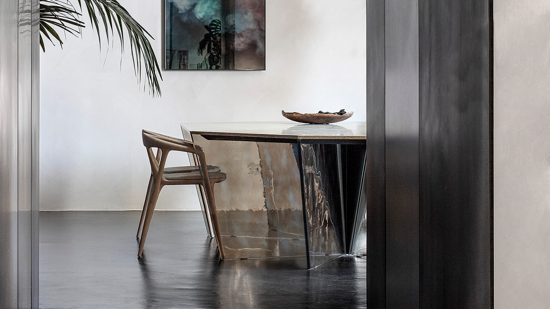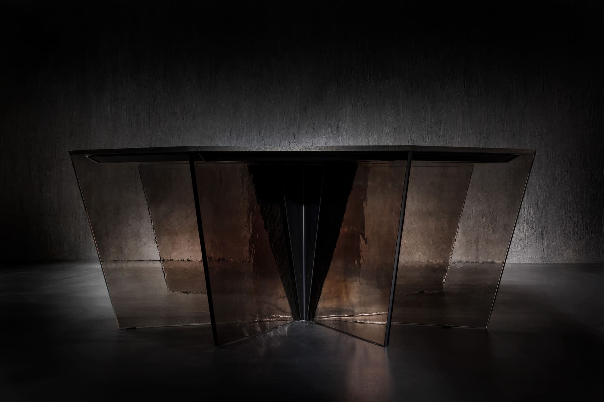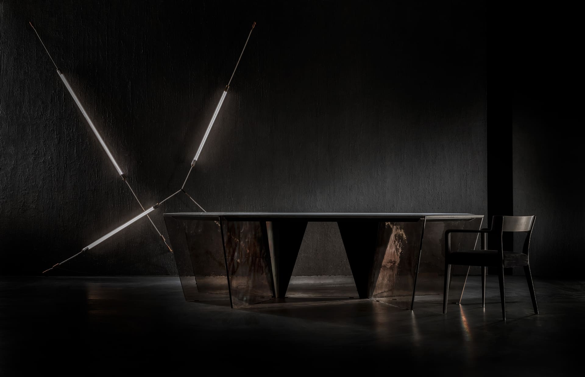 Стол Gotham, неожиданный синтез прочности и легкости, сочетает в себе изысканную восьмиугольную столешницу из натурального камня с тонкими треугольными ножками из литого стекла. Бриллиант, расположенный среди венчика мимолетных оттенков.