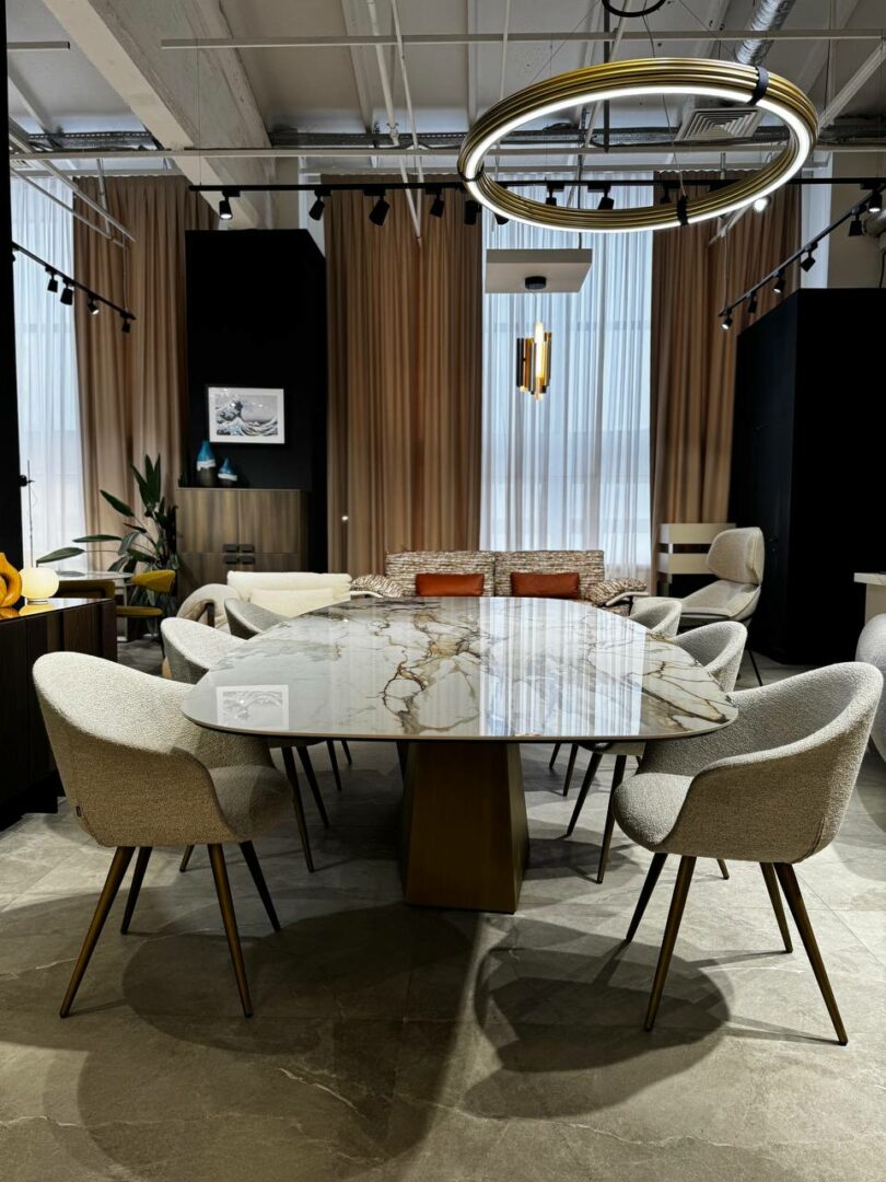 Геометрическое основание стола и мягкая форма столешницы с скругленными углами — идеально подойдет в интерьер большой гостиной.