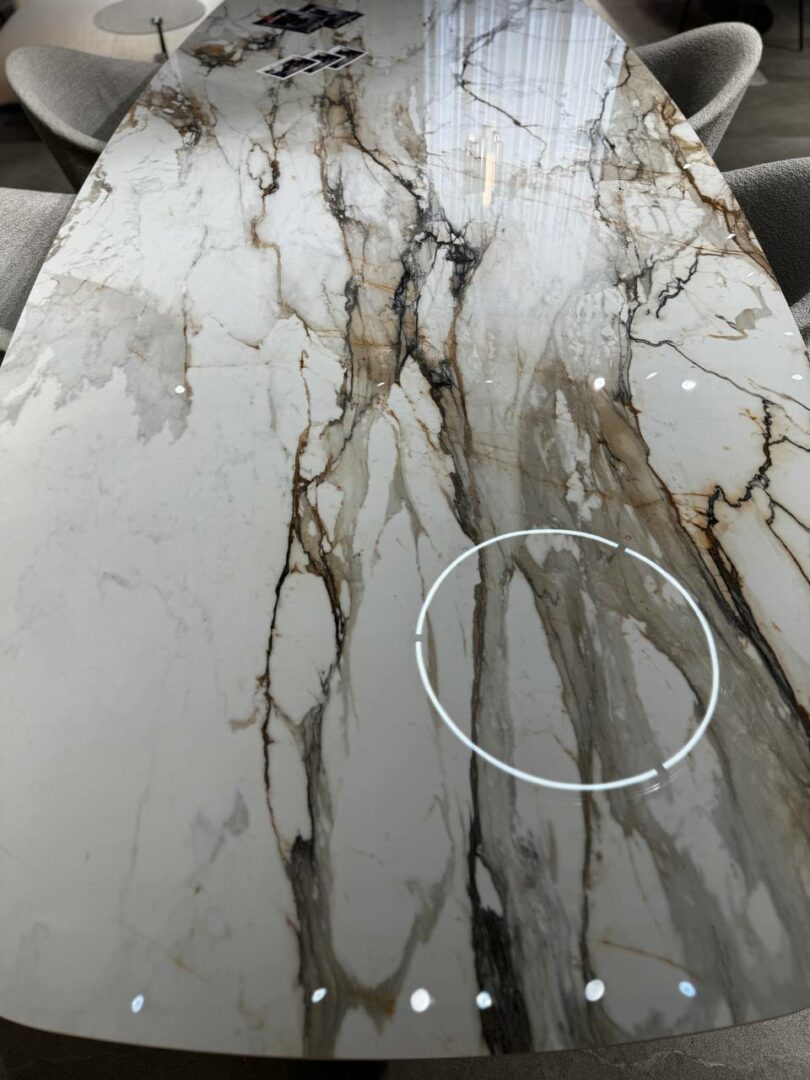 с керамогранитной столешницей и металлическим основанием под латунь для рассадки 10-12 персон