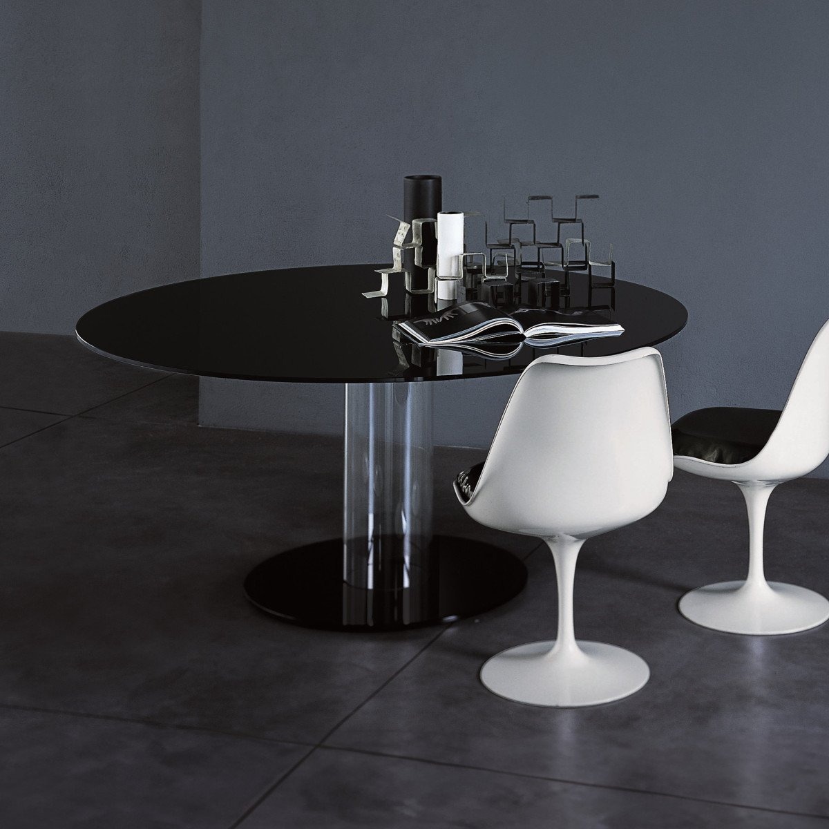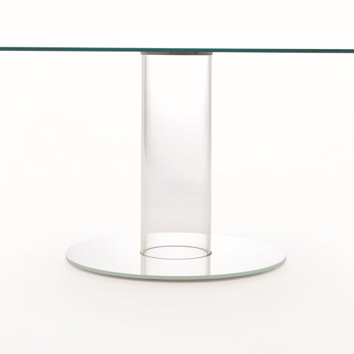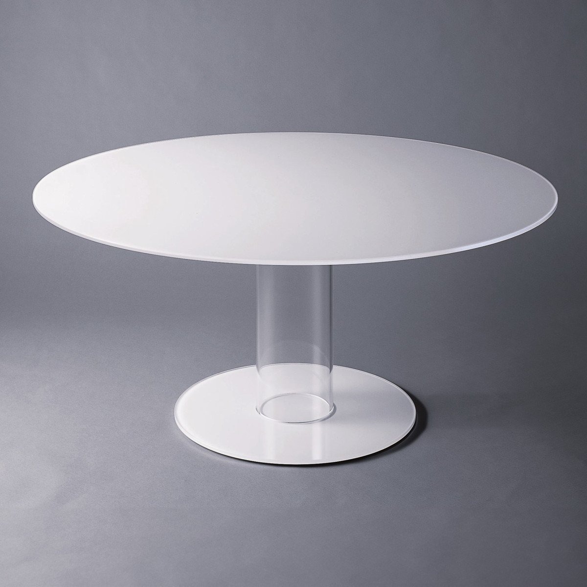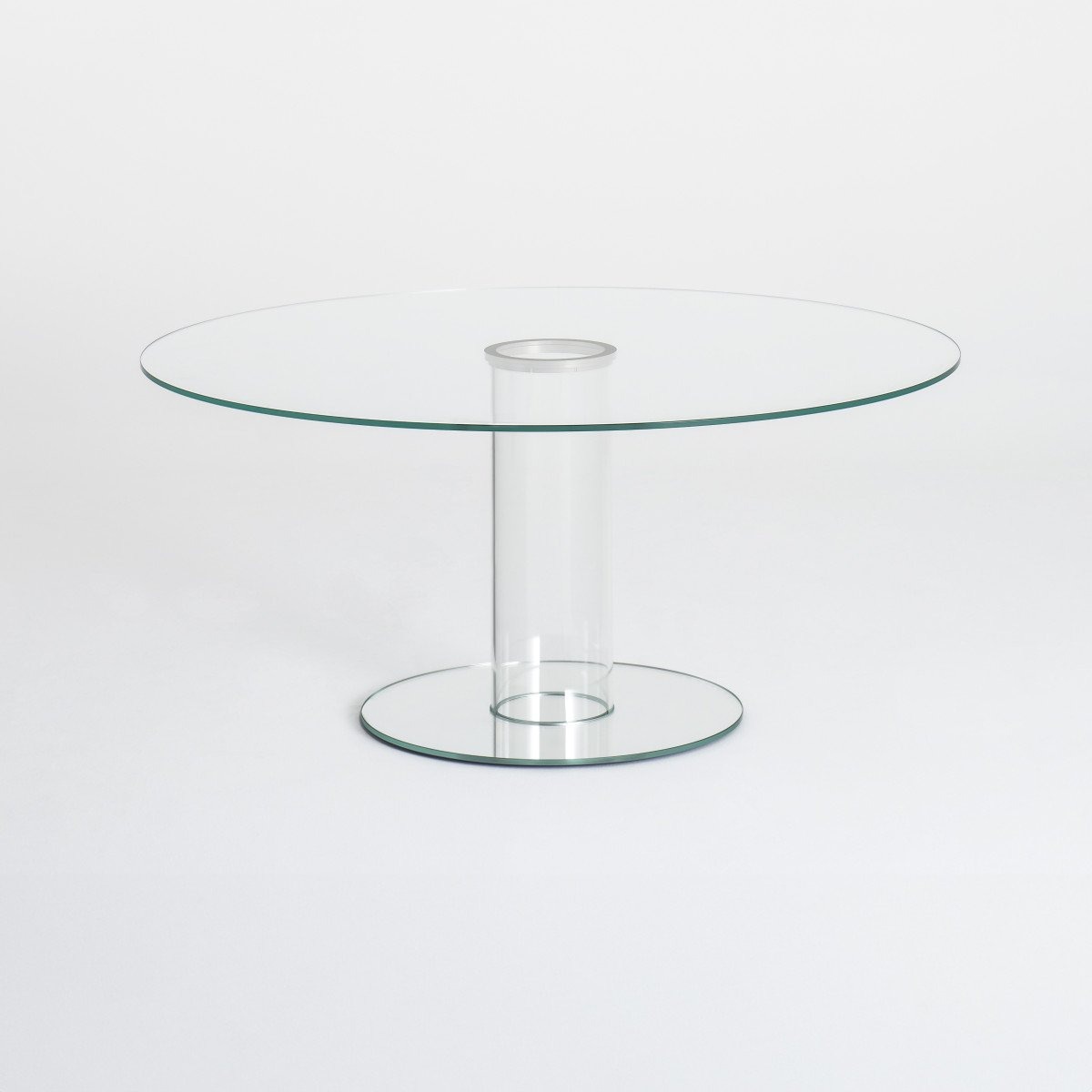 Серия круглых высоких столов. Столешница из закаленного стекла толщиной 12 мм опирается на основание, состоящее из полого цилиндра из боросиликатного стекла и ножки из стекла толщиной 12 мм, которые служат балластом. Столешница и ножка могут быть изготовлены из глянцевого или матового лакированного стекла, а также из прозрачного сверхлегкого стекла и ножки из сверхлегкого зеркала. Столешницу можно разобрать и закрепить на основании с помощью колец из нержавеющей стали и анодированного алюминия.