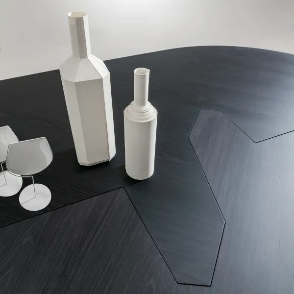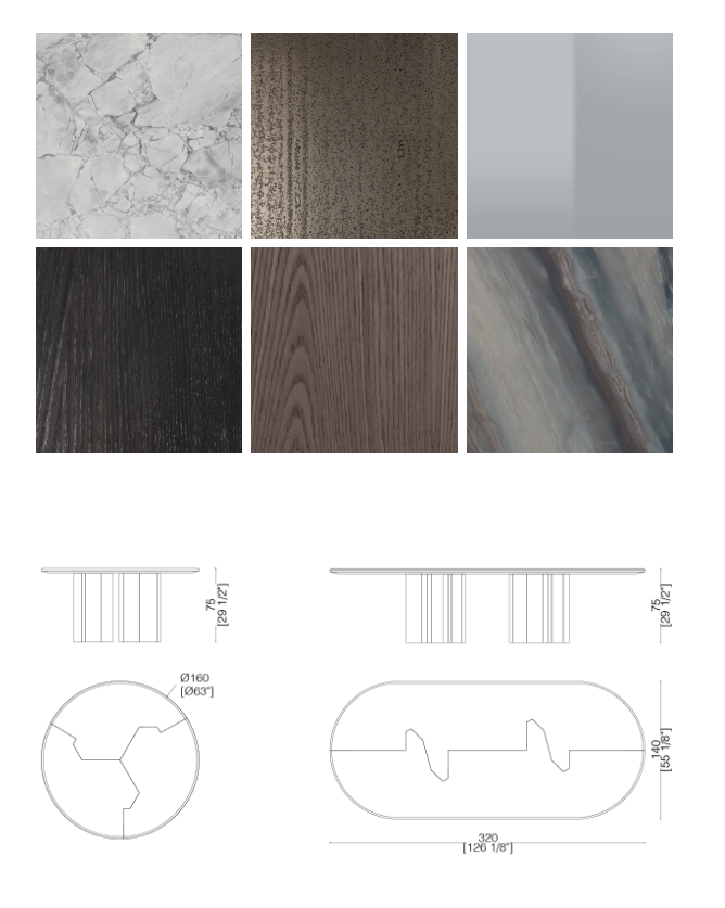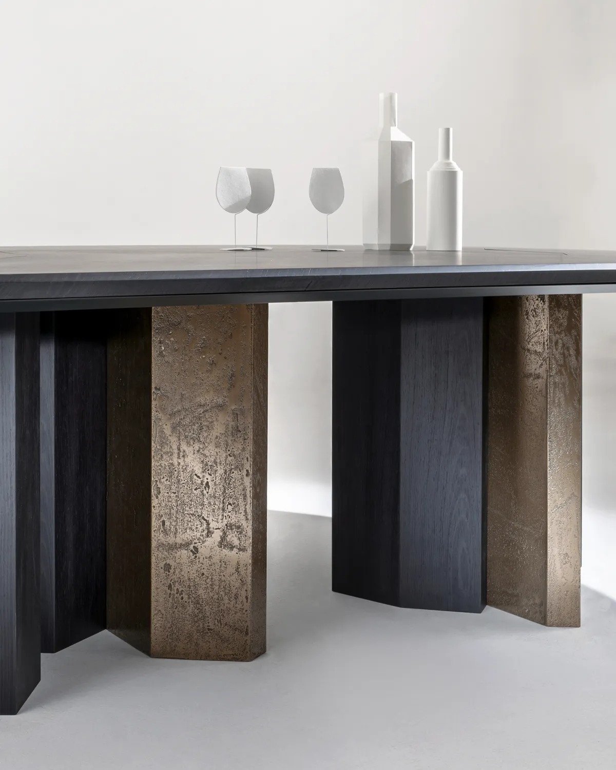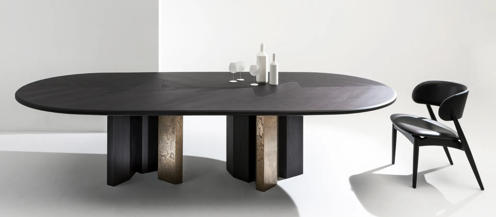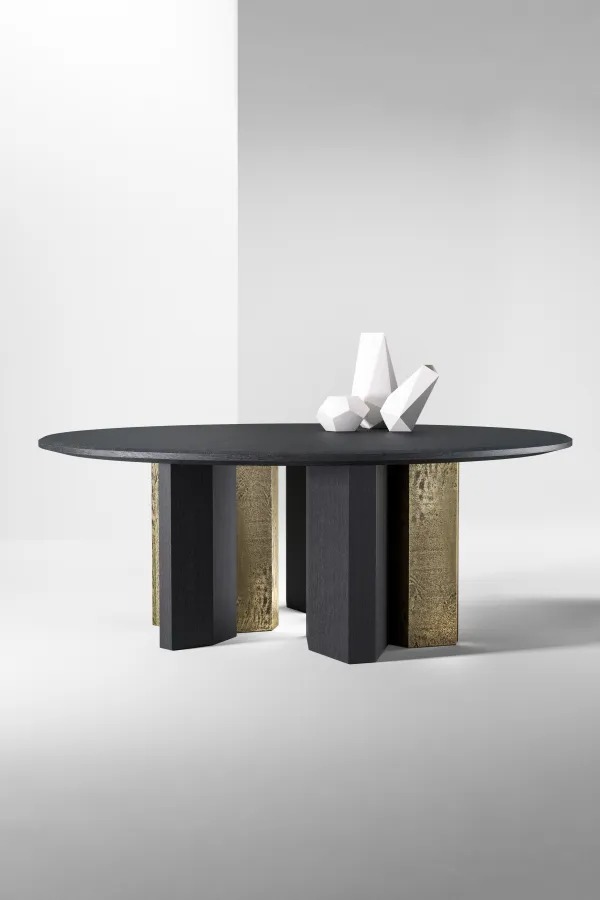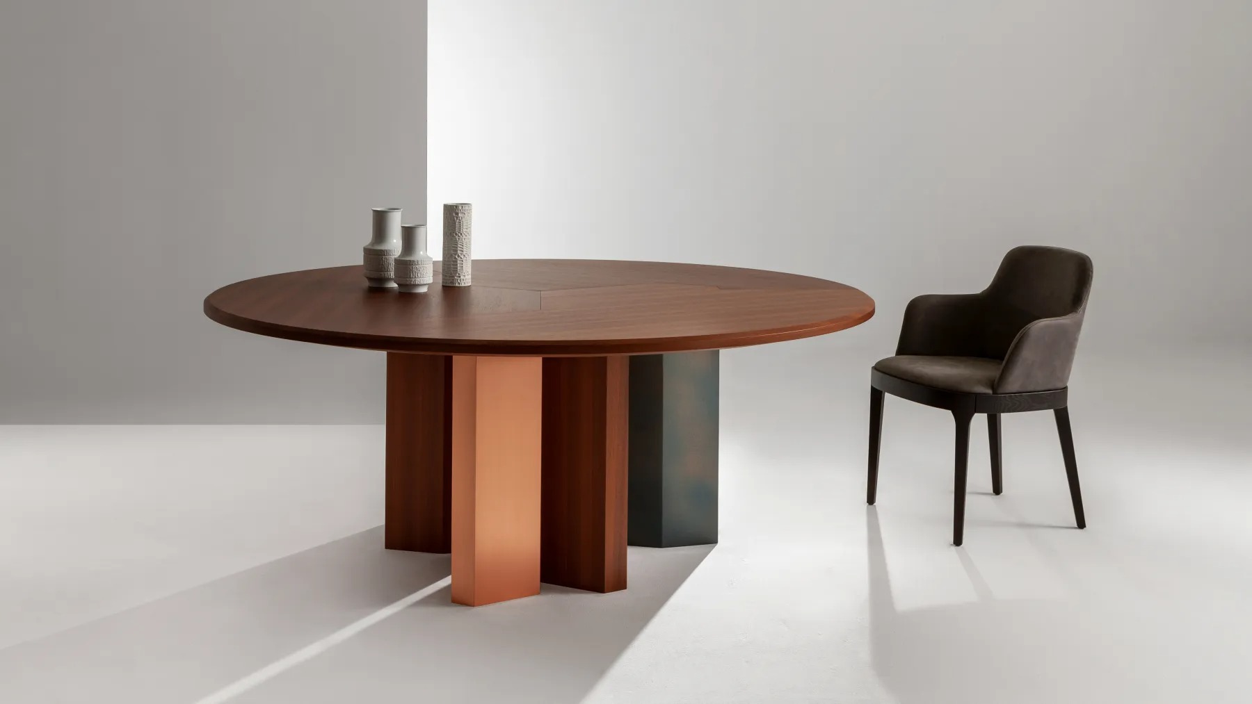Круглый или прямоугольный стол доступен в различных размерах, с модульной столешницей из дерева или мрамора и внушительным основанием в форме призмы.