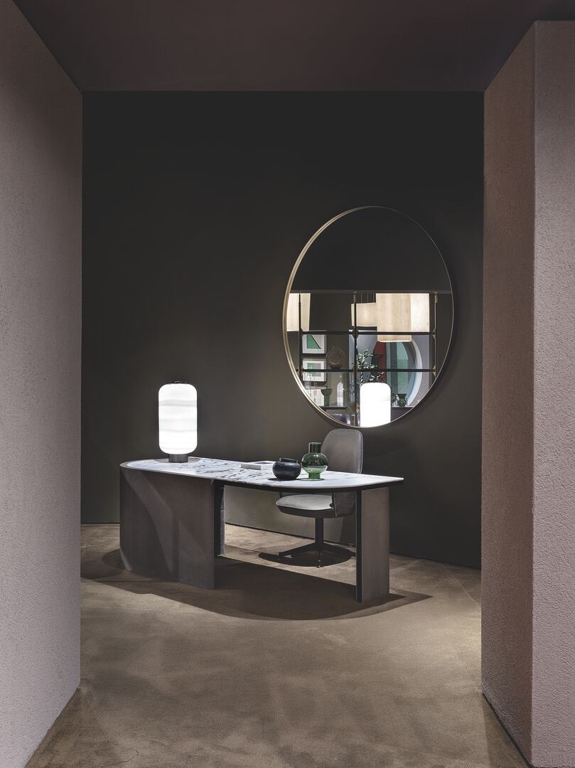 Письменный стол Joni Stone с каменной столешницей открывает новое видение обстановки кабинета, свободное от строгости и лишних конструкций. Коллекция Joni, разработанная Кристофом Делькуром для компании Baxter, представляет собой идеальный синтез цельных элементов и пустот, плавных линий и закругленных углов, чередующихся и сливающихся. В ней обыграно единство и противостояние симметрии и гармоничной асимметрии: от невысокого шкафа, служащего элементом хранения, до широкого рабочего стола и модульного стеллажа для книг, стоящего отдельно.