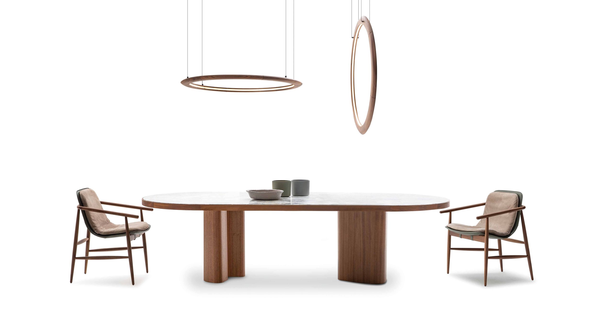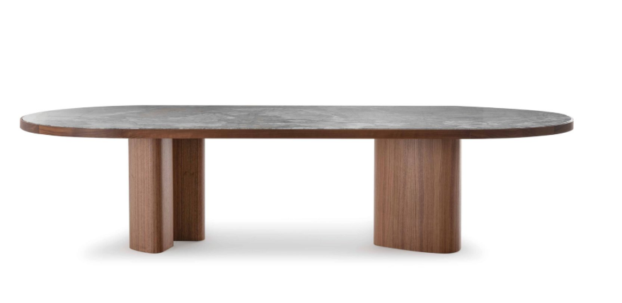 Столешница с массивной американской рамой, отделанной мрамором, или с различными вариантами отделки. Ножки треугольной формы, облицованные американским орехом.