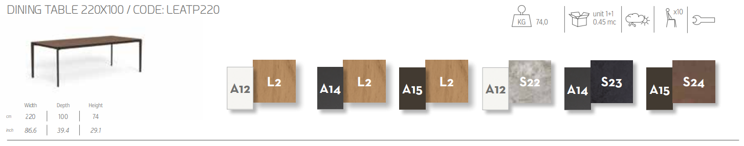 Обеденный стол размером 220×110 см из коллекции Leaf идеально подходит для уличной мебели. Столешница vitter, доступная в трех цветах, опирается на элегантную алюминиевую раму. За ней легко могут разместиться до 10 человек.