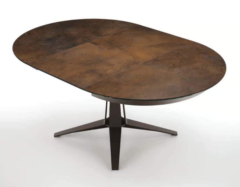 Выдвижной стол с основанием на четырех спицах. Доступен в различных размерах с круглой или бочкообразной столешницей.