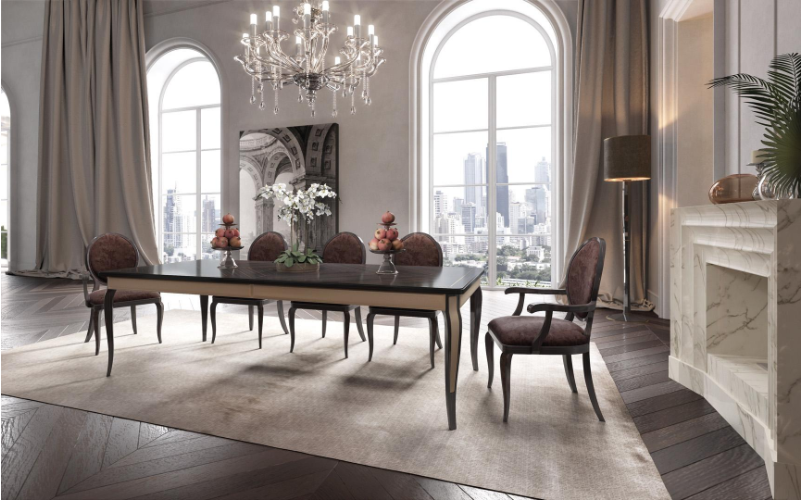 Прямоугольный стол элегантно изогнутых форм подходит для различных пространств и стилей. Структура в сущности. Верх из эссенции инкрустирован металлическими вставками. Кожаные боковые полосы. Вставки кожаные ножки. Доступен в расширяемой версии.
