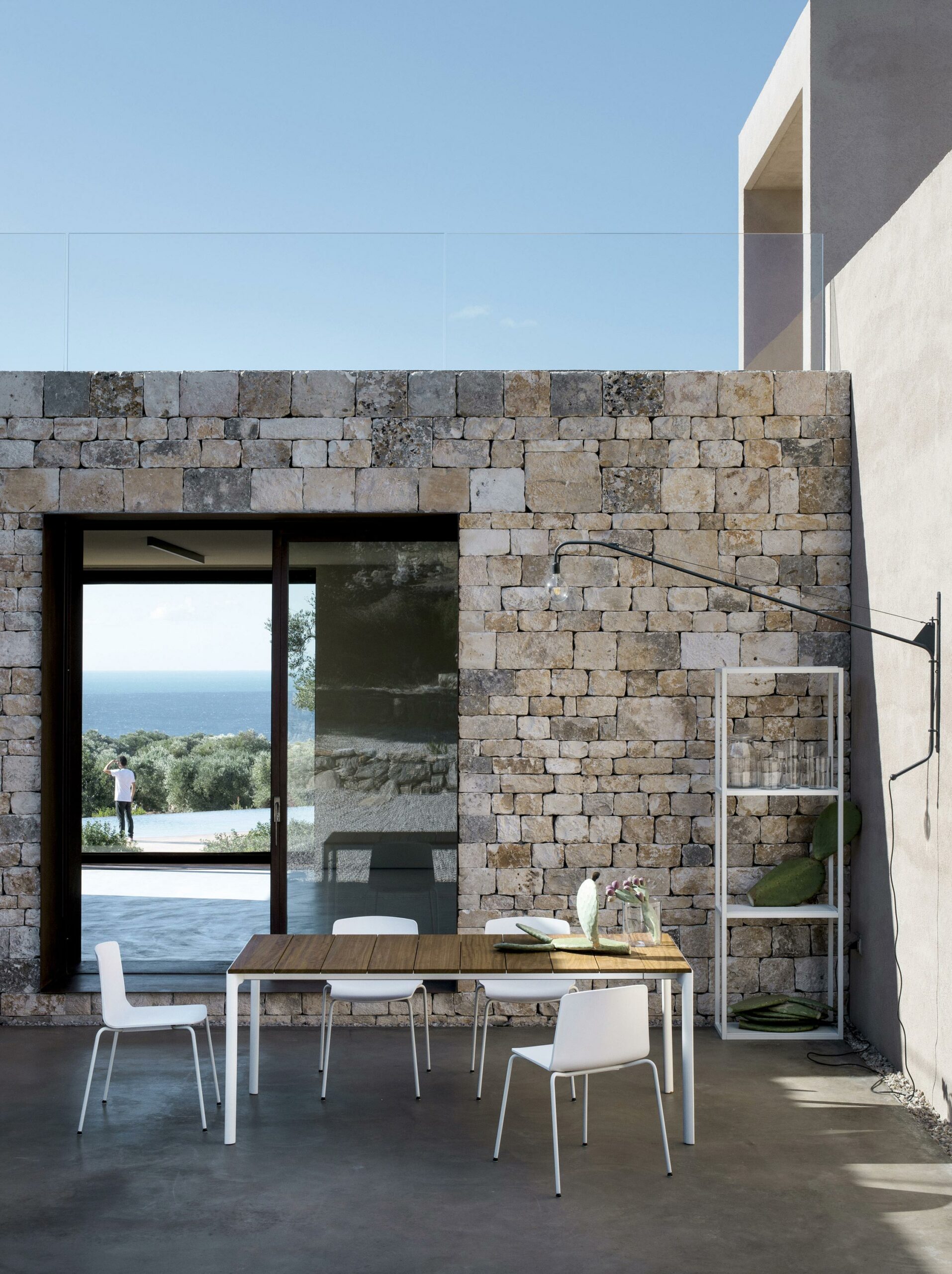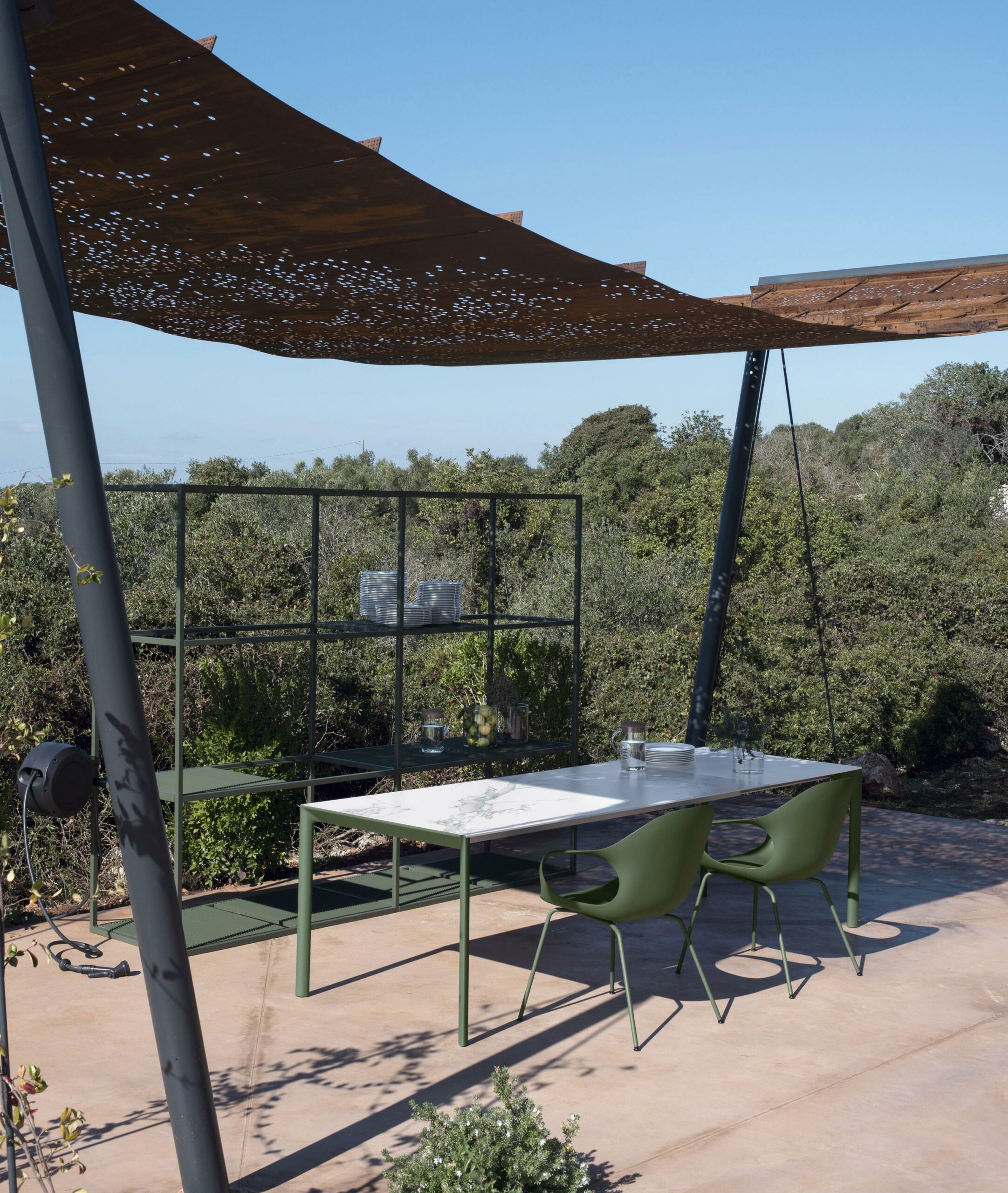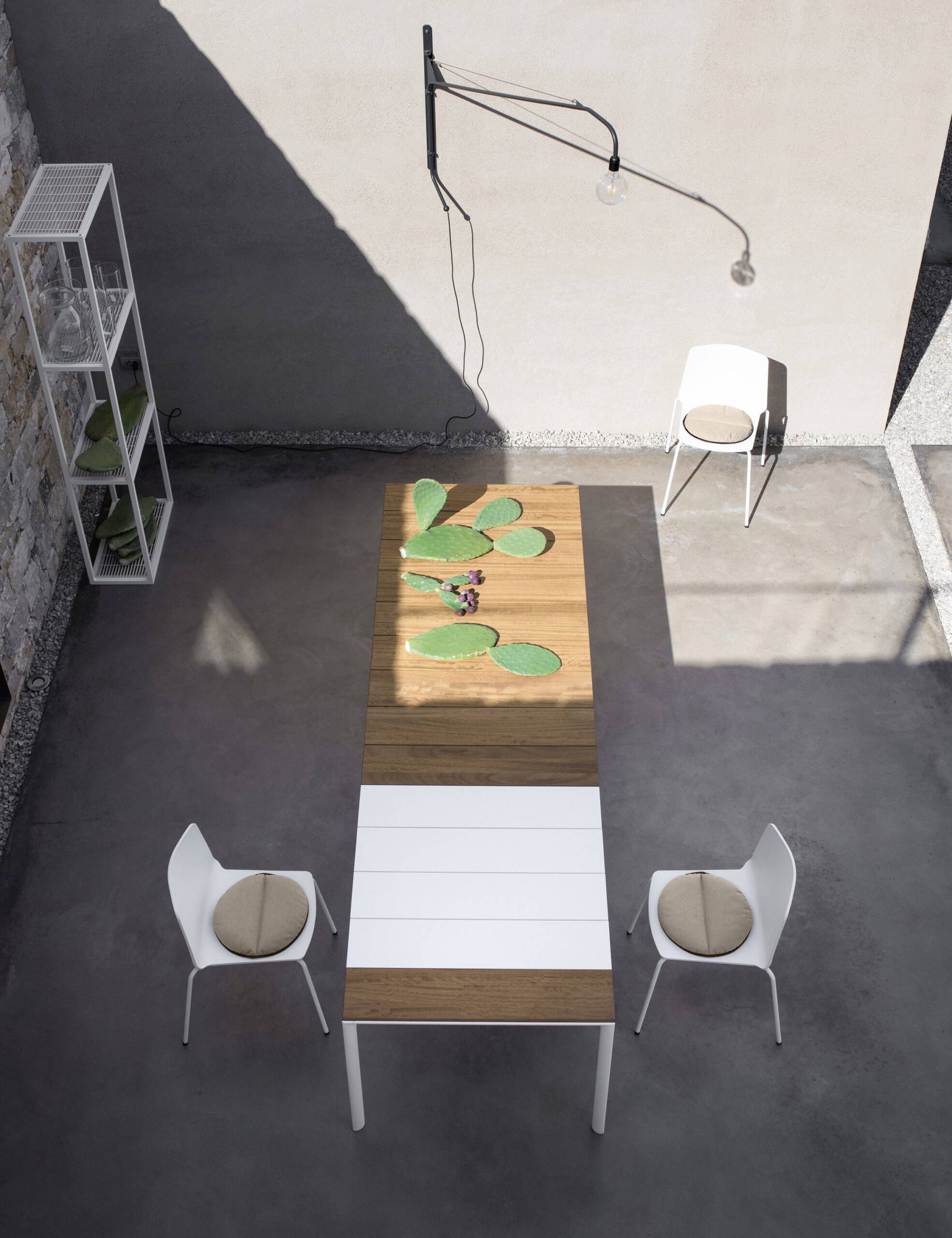 Ножки столов Maki округлой формы сочетаются со столешницей из тикового дерева шириной 20 см и толщиной 2 см, сертифицированной FSC для защиты окружающей среды. Столешницу можно оставить в ее естественном цвете, так как со временем она приобретает серебристый оттенок, который ни с чем нельзя спутать, или обработать маслом, чтобы вернуть ей первоначальный цвет. Выдвижные столы оснащены выдвижными алюминиевыми накладками, размещенными в специальном отсеке.