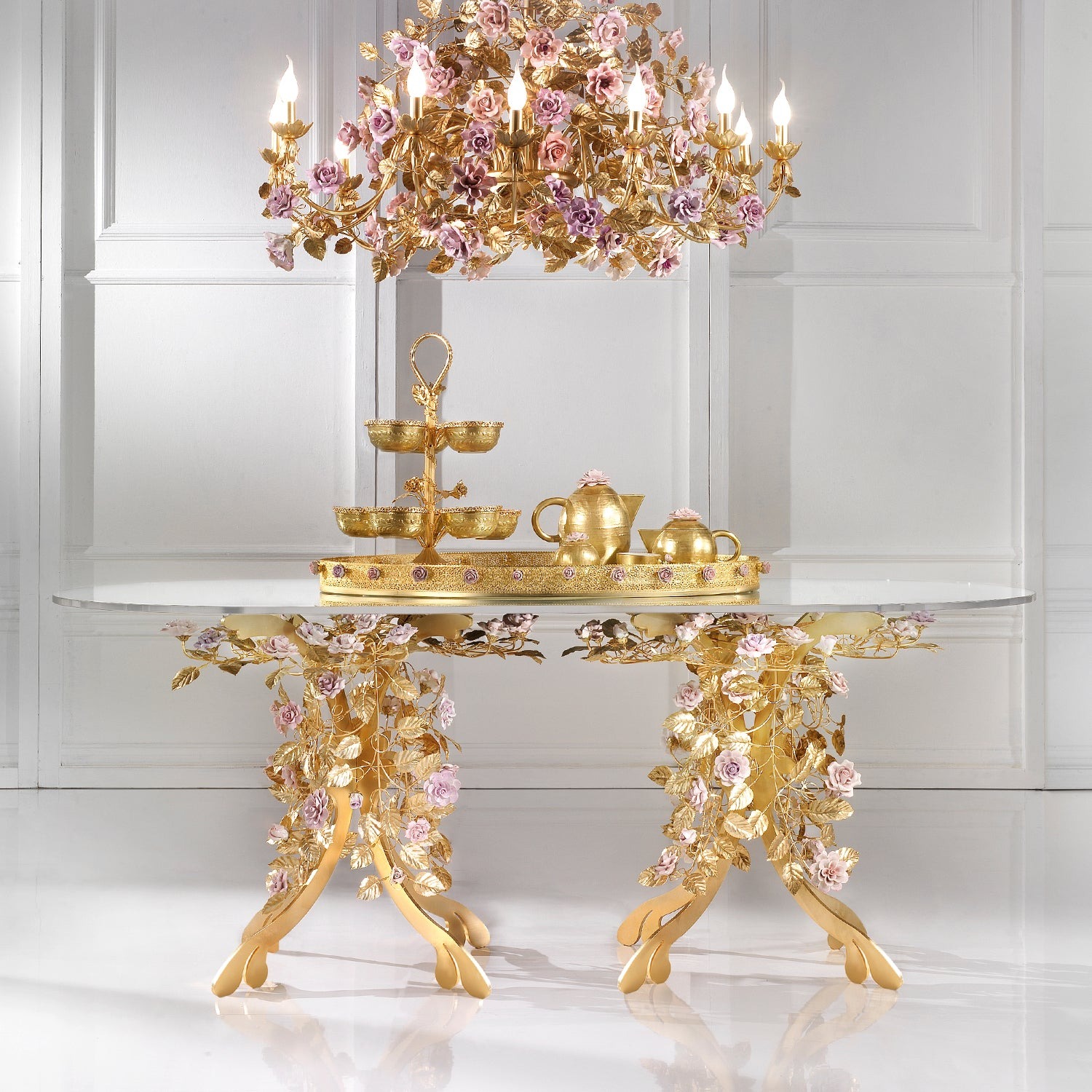 Обеденный овальный стол Marie Antoinette — это удивительное воплощение искусства. Он изготовлен из драгоценной латуни с позолотой в 24 карата, украшен сотнями маленьких изящных розовых листочков и украшен прекрасными фарфоровыми розами, приглядевшись к которым, вы заметите, что ни одна роза не похожа на другую. Каждый изящный фарфоровый цветок, нежный и изысканный, изготовлен нашими мастерами и доступен в различных цветах. В этой модели представлены розы различных оттенков розового, сиреневого, персикового цвета фуксии, что создает натуралистичное сочетание цветов, напоминающее о великолепии знаменитой принцессы. Мария-Антуанетта, которую враги считали беспечной и бескорыстной, больше заботившейся о своей прическе, чем о правительстве Франции, на самом деле была современной женщиной. Она смогла подтвердить, что высокое положение у власти не является несовместимым с желанием быть красивой женщиной, следящей за модой. Французская королева продемонстрировала, что изысканное существование может усилить власть.