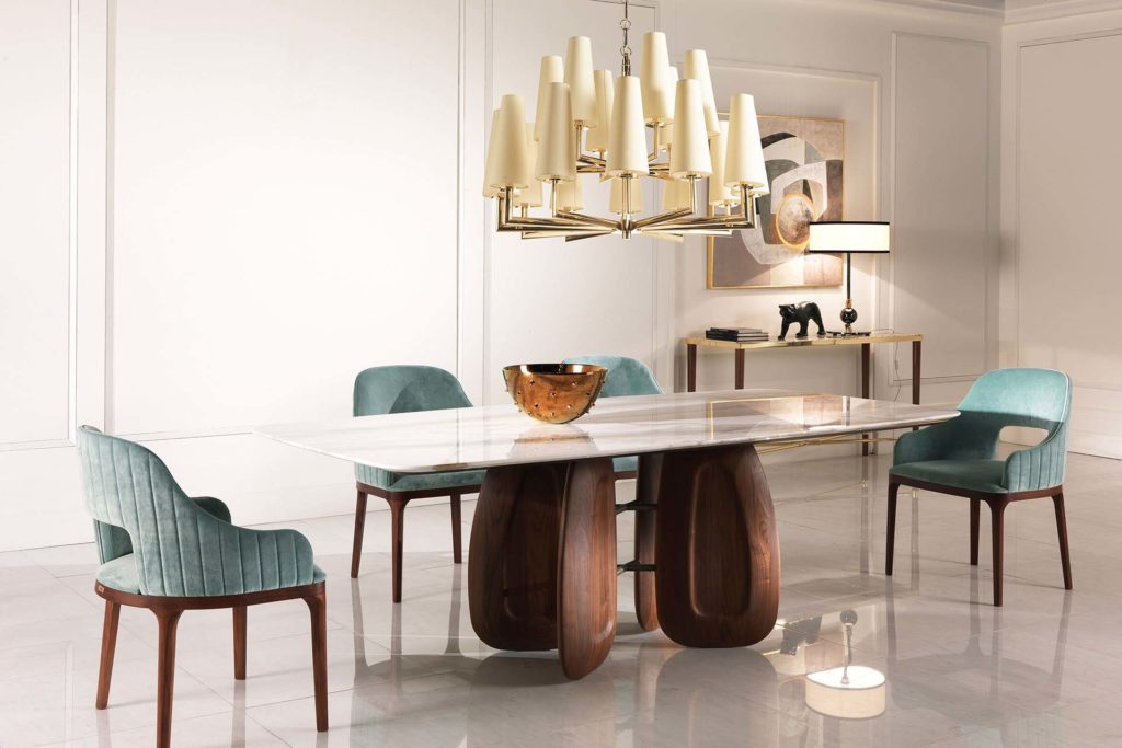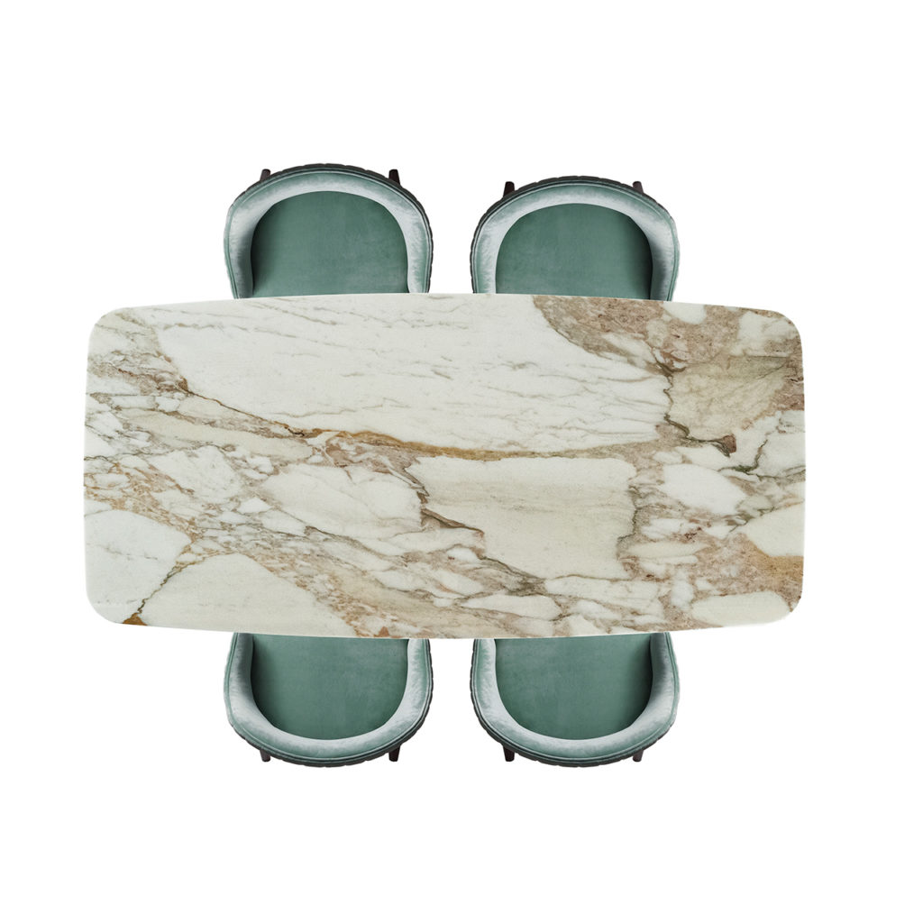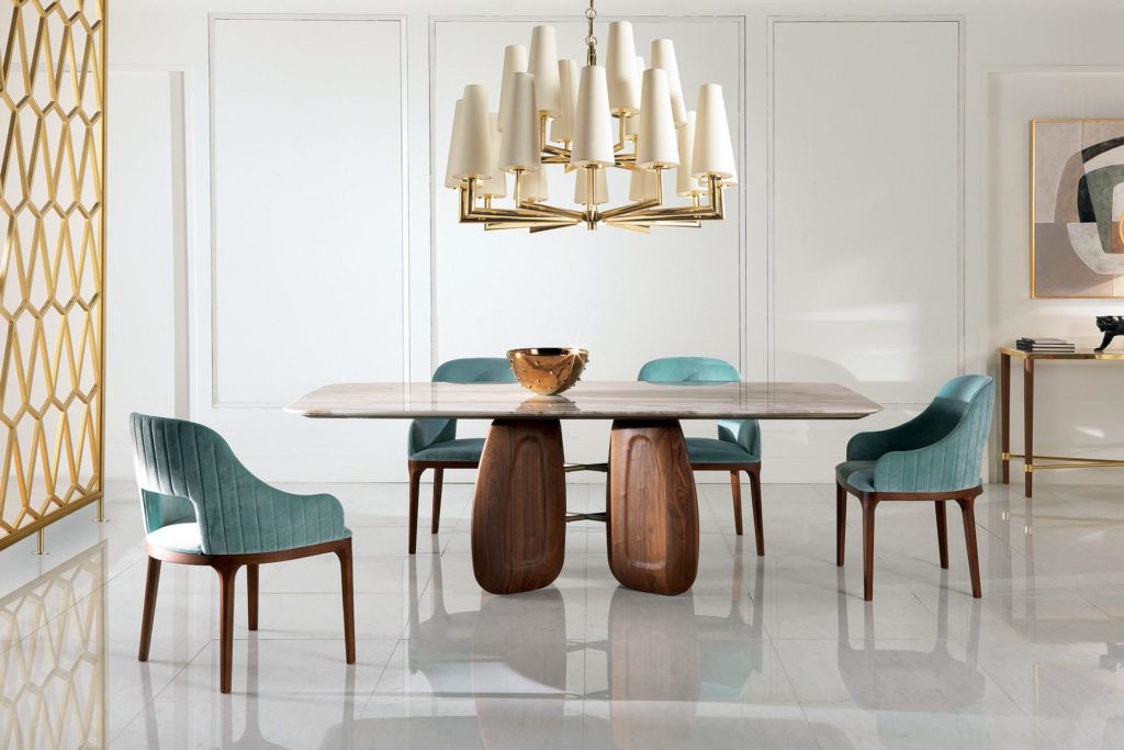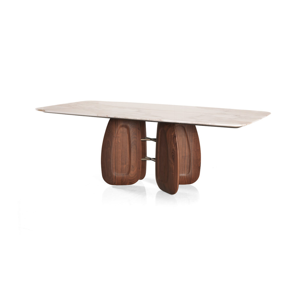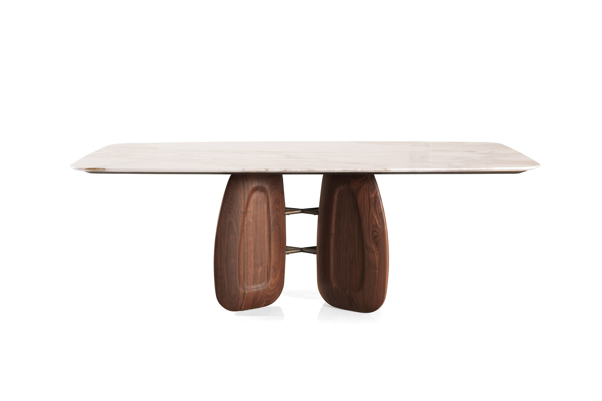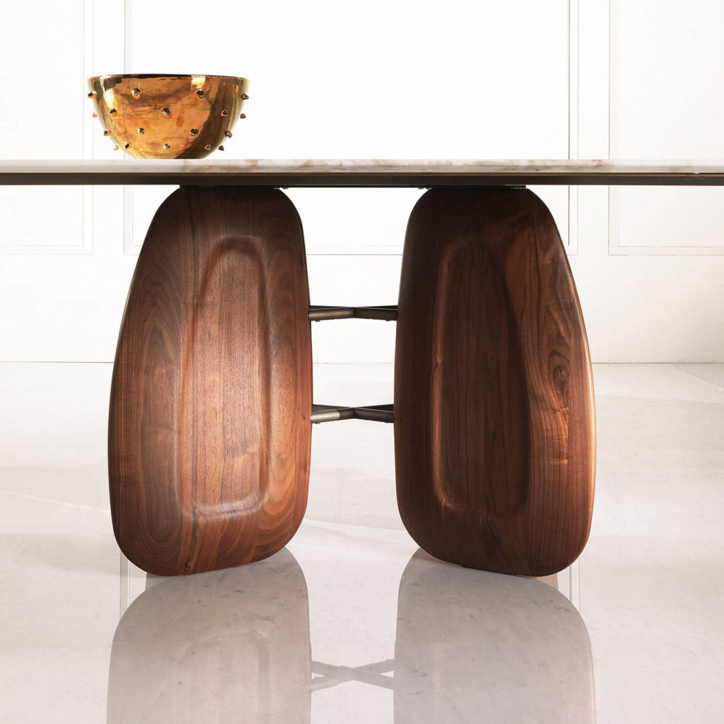 MARIPOSA-это фирменный обеденный стол из матового ореха Каналетто с мраморным верхом. Игра масс, выраженная твердым скульптурным присутствием ног МАРИПОЗЫ, контрастирует с элегантностью ее мраморной столешницы.