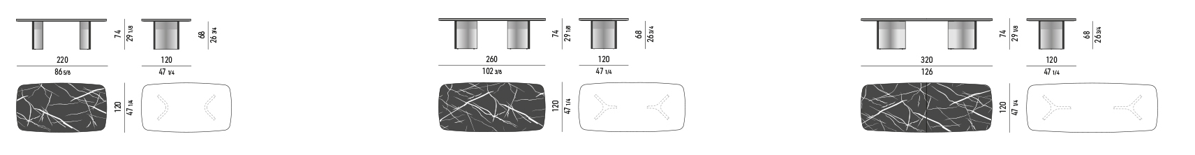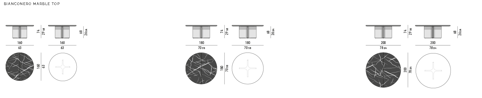 Столешница доступна в двух вариантах: мрамор Bianconero с контрастными оттенками для современного интерьера или мрамор Marron Damasco для классической элегантности. Также предлагается версия из матового ясеня с черным лаковым покрытием.