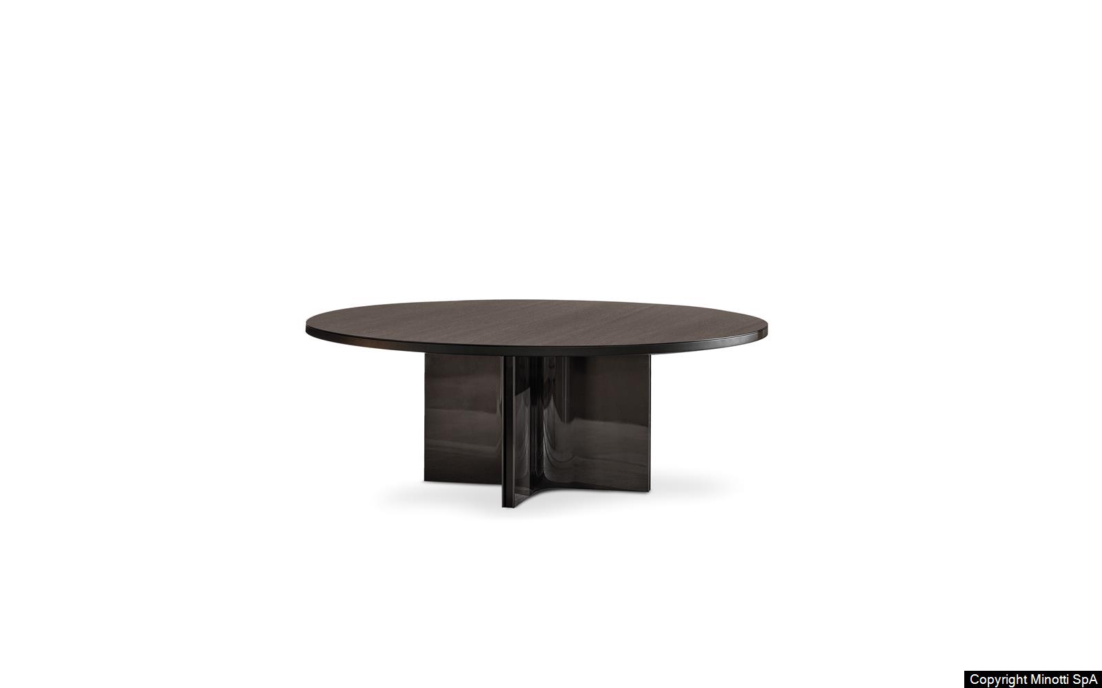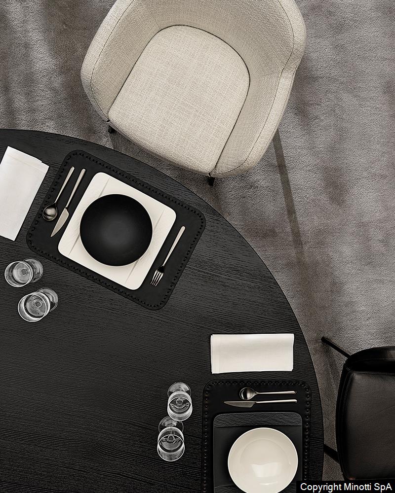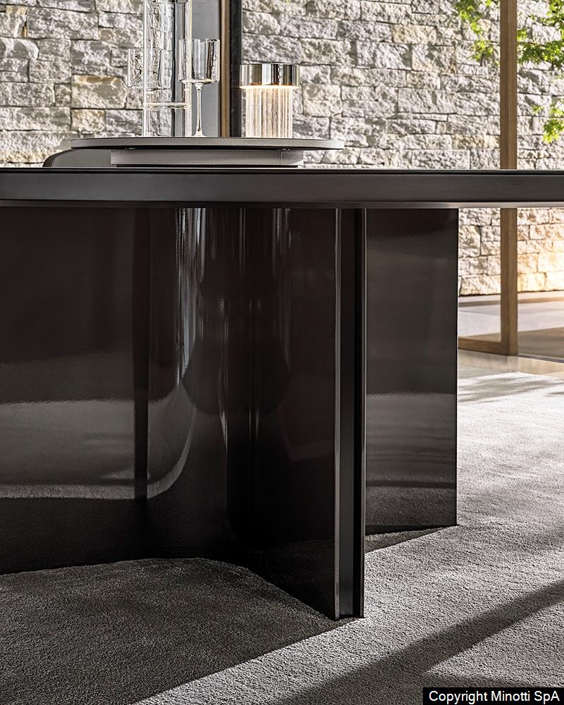 Основание стола Marvin напоминает архитектурный манифест: полукруглые поверхности, подсвеченные металлическим блеском, и черная вставка создают динамичный визуальный эффект. Дизайнеры MINOTTI вдохновлялись современной архитектурой, что отразилось в: