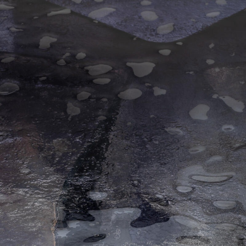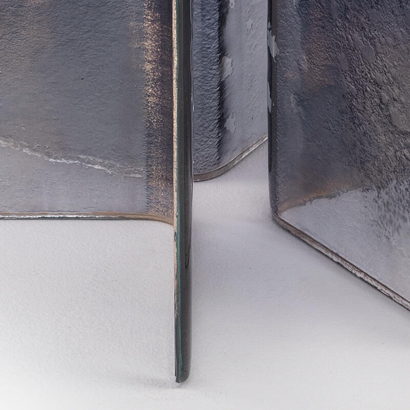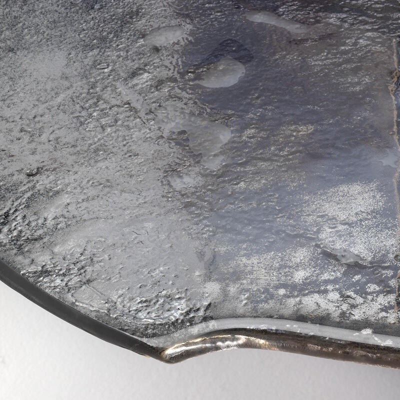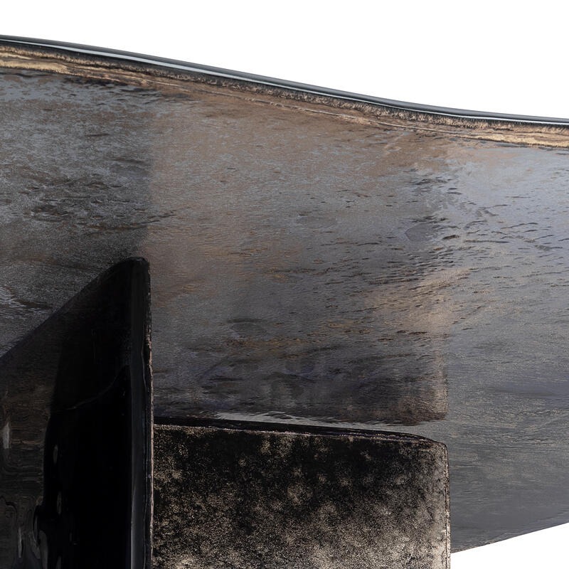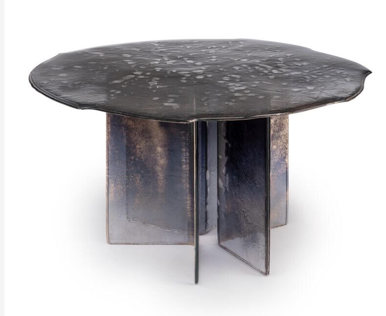 Столешница и ножки из обожженного стекла в два слоя с неровными краями. Все изделие покрыто лаком различной цветовой гаммы от темно-синего до прозрачного с частичным посеребрением с обратной стороны.