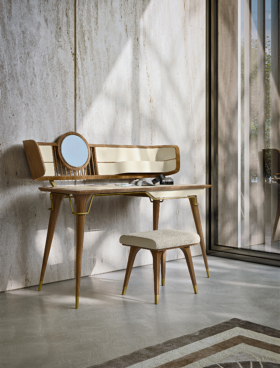 Итальянский стол Melting Light от фабрики TURRI – воплощение роскоши и элегантности. Изготовлен из натурального дерева с кожаными вставками и декоративными элементами из матового золотистого металла. Модель оснащена выдвижным ящиком, а также может комплектоваться зеркалом и дополнительной панелью. Извилистые формы и безупречная итальянская отделка делают этот туалетный столик настоящим произведением искусства. Доступен в различных вариантах отделки – для точного соответствия вашему интерьеру.