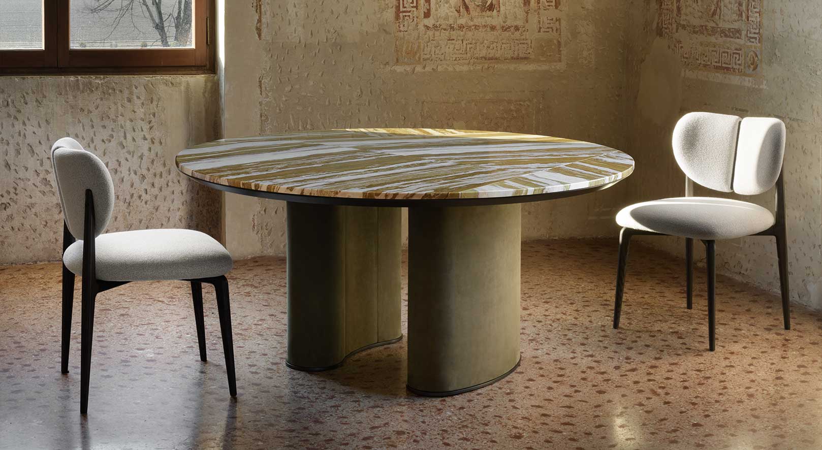 Специальная столешница из композитного мрамора создает узор, который придает изделию большую динамичность и напоминает об атмосфере 30-х годов.