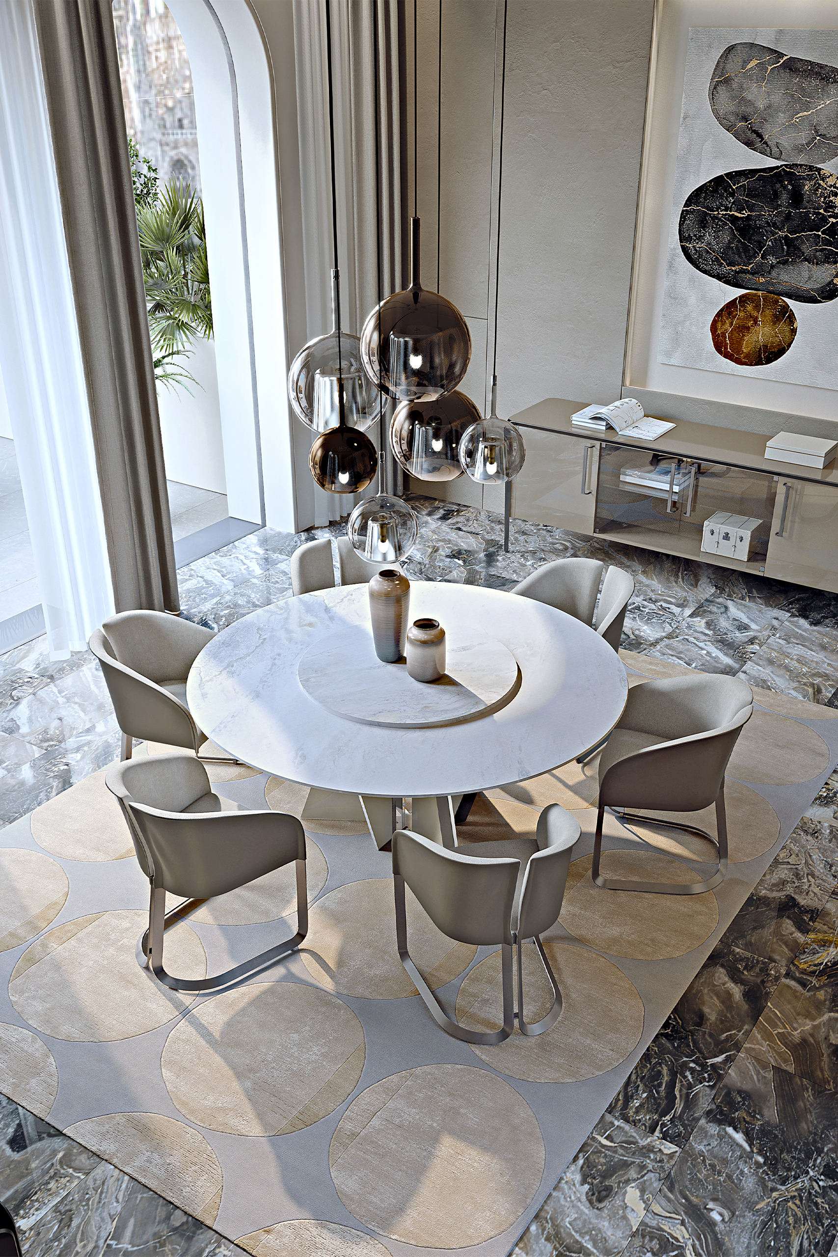 Благодаря возможности выбора отделки (цвет мрамора, оттенок дерева, тип кожи) стол легко впишется в любой интерьер — от классики до современного минимализма.