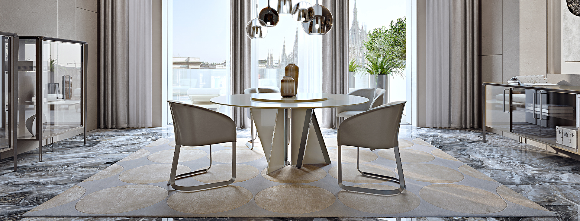Круглая столешница стола Milano round — это символ совершенства, воплощенный в мраморе или глянцевом лакированном дереве. Основание, выполненное в виде геометрической композиции, придает модели динамику и современность. Диагональные разрезы деревянных элементов, покрытых высококачественным лаком, создают эффект движения, а кожаная отделка и металлические детали добавляют нотку эксклюзивности. Этот стол — не просто мебель, а арт-объект, который преобразит любое пространство.