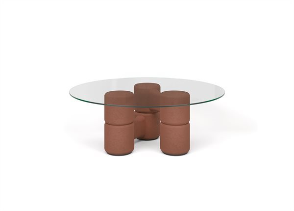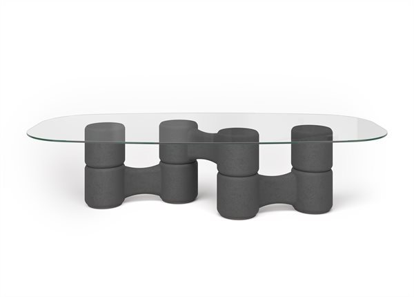 Стол с закаленным прозрачным хрустальным верхом 15 мм. Основание, образованное деревянными цилиндрами с ручным шпателем. Доступен в цветах кирпича, веревки, угля или слоновой кости.