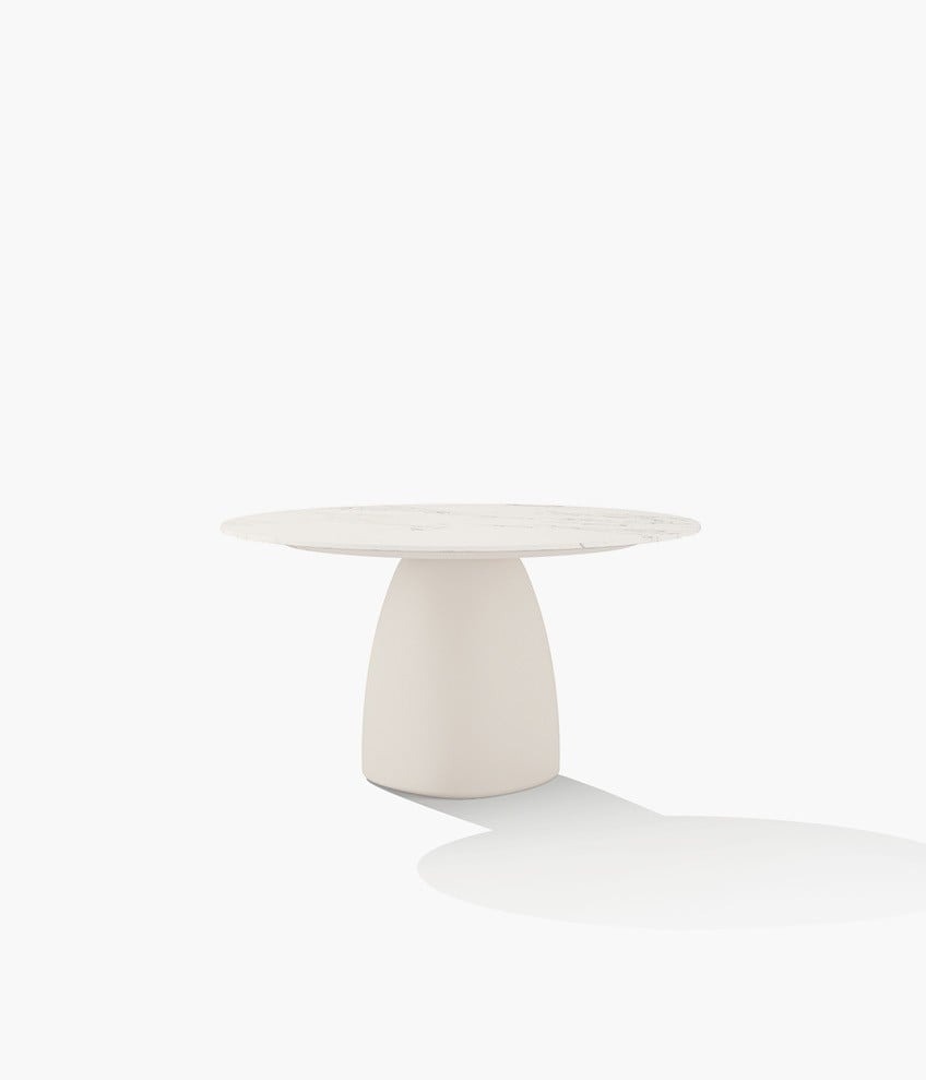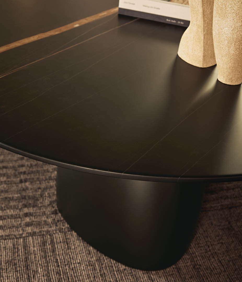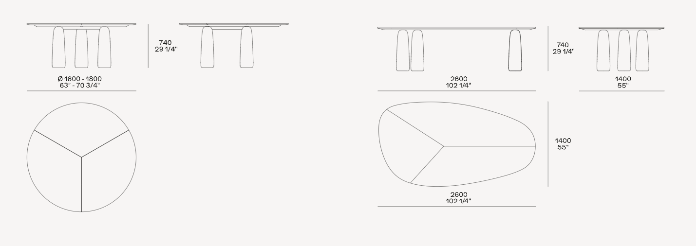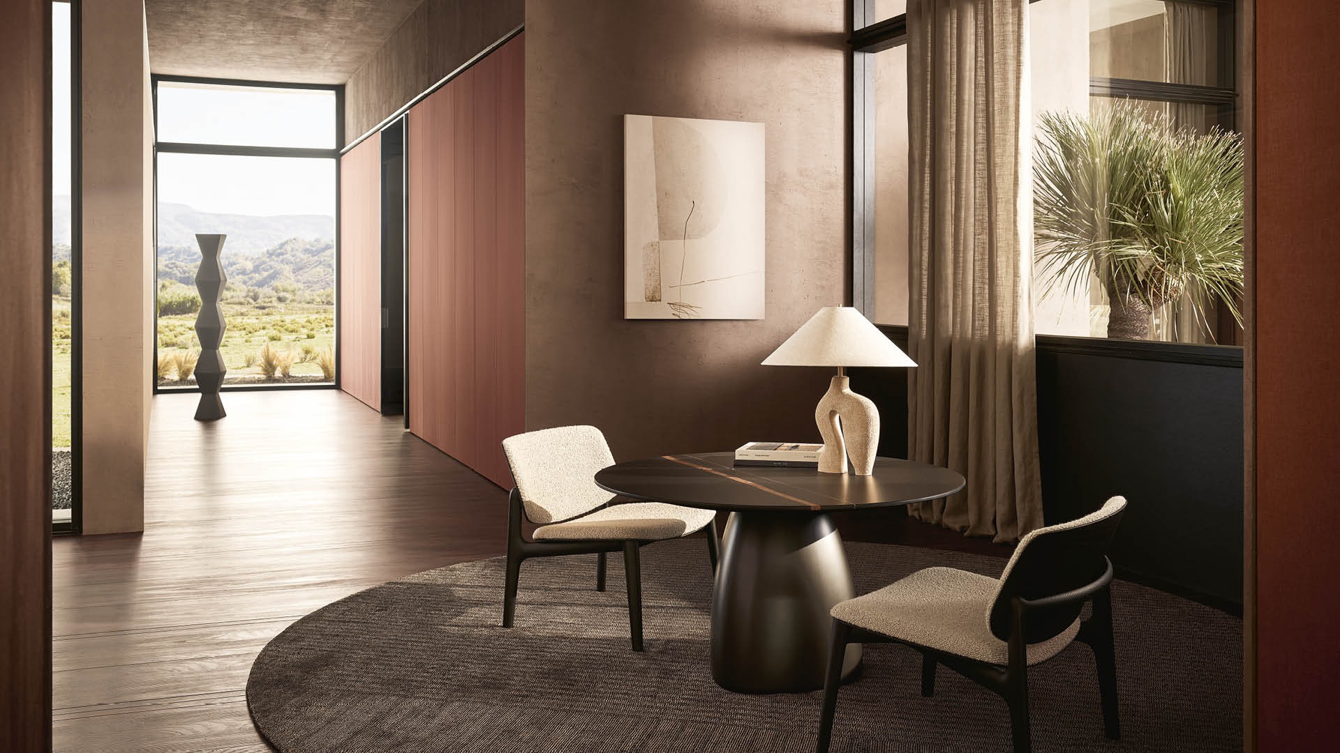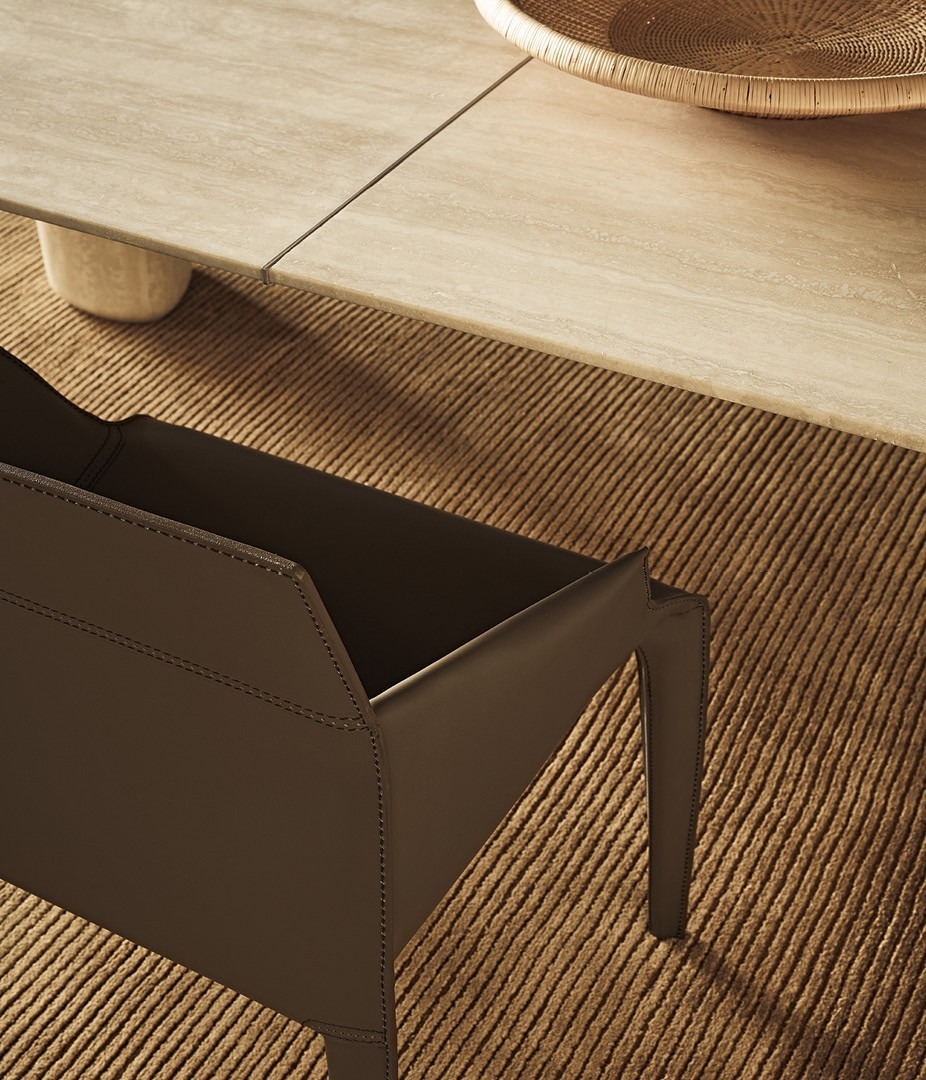 В коллекции Monolith для внутренних помещений Эммануэль Галлина переосмысливает архаичные очертания дольмена с помощью теплых и изящных материалов. Столешница выполнена из черного вяза или мрамора травертин, и в сочетании с основанием в той же отделке создает внушительную и монументальную монолитную конструкцию.
