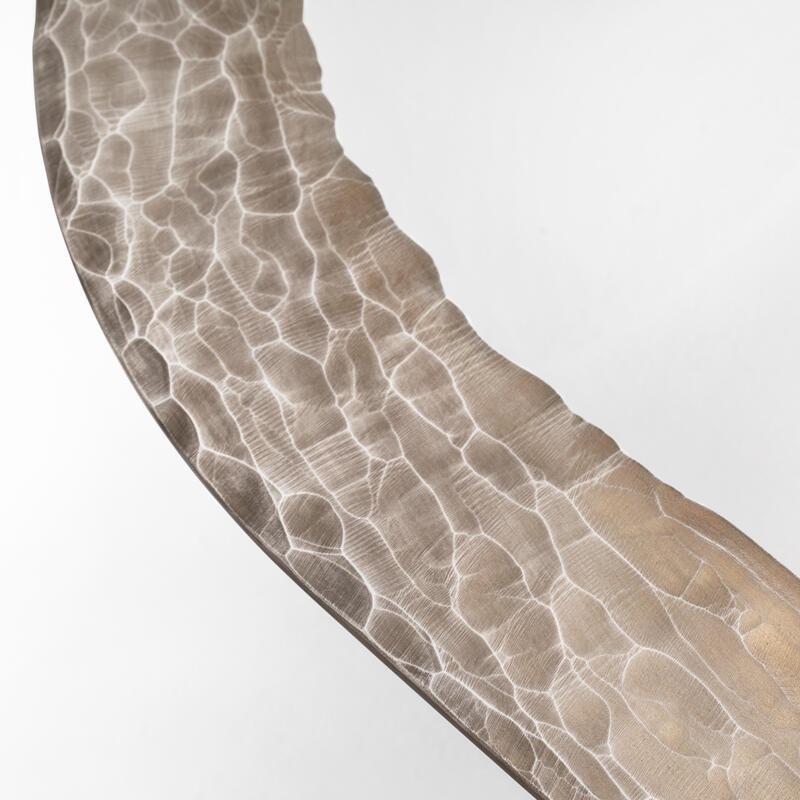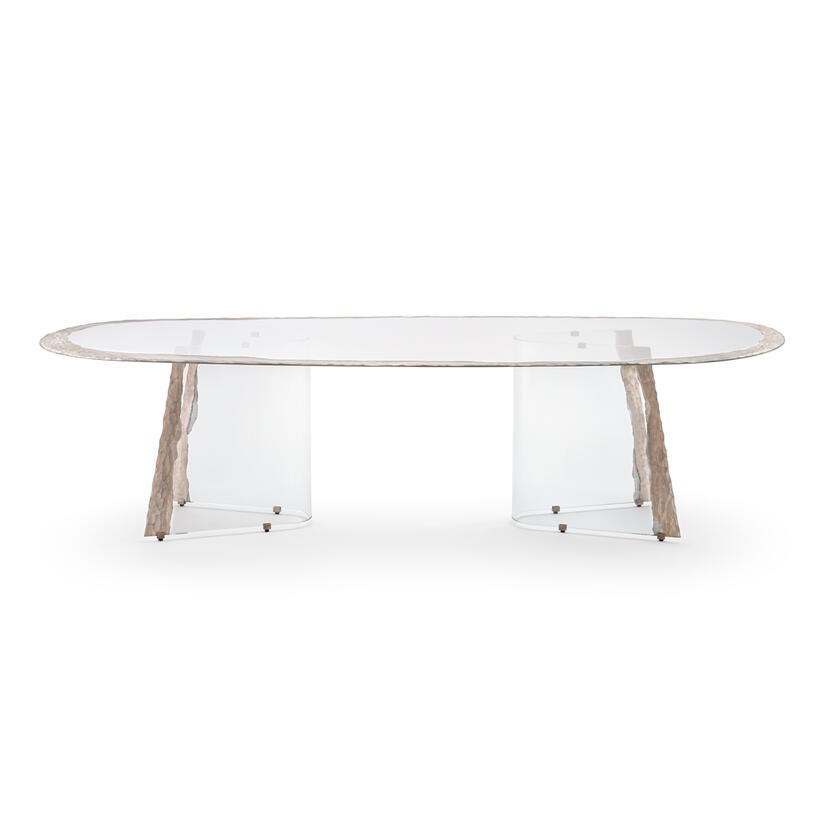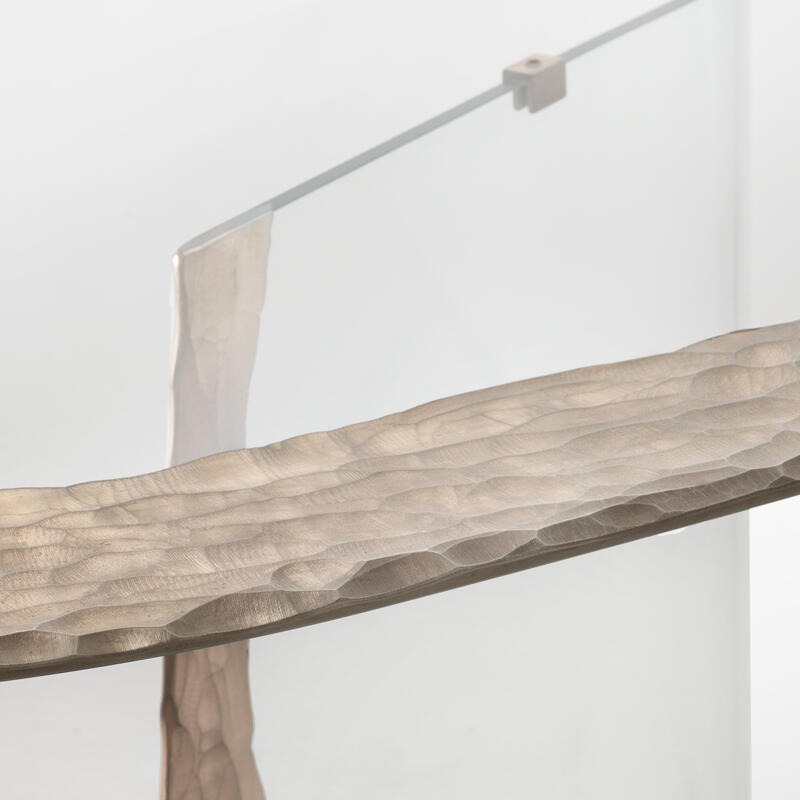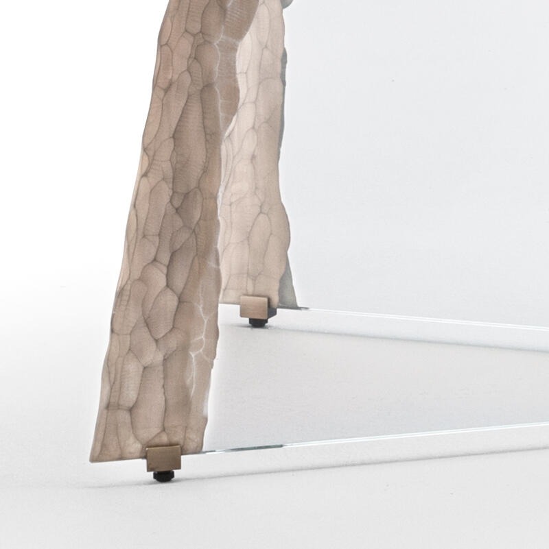 Столешница и двойная изогнутая ножка из особо прозрачного стекла. Все они выгравированы по краям алмазным шлифовальным кругом и покрыты серебряным покрытием.