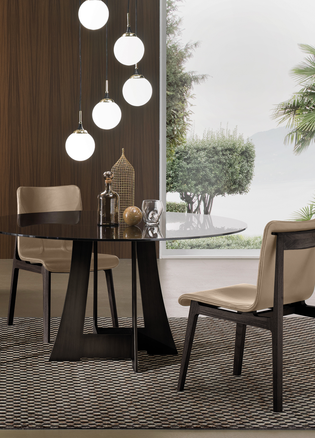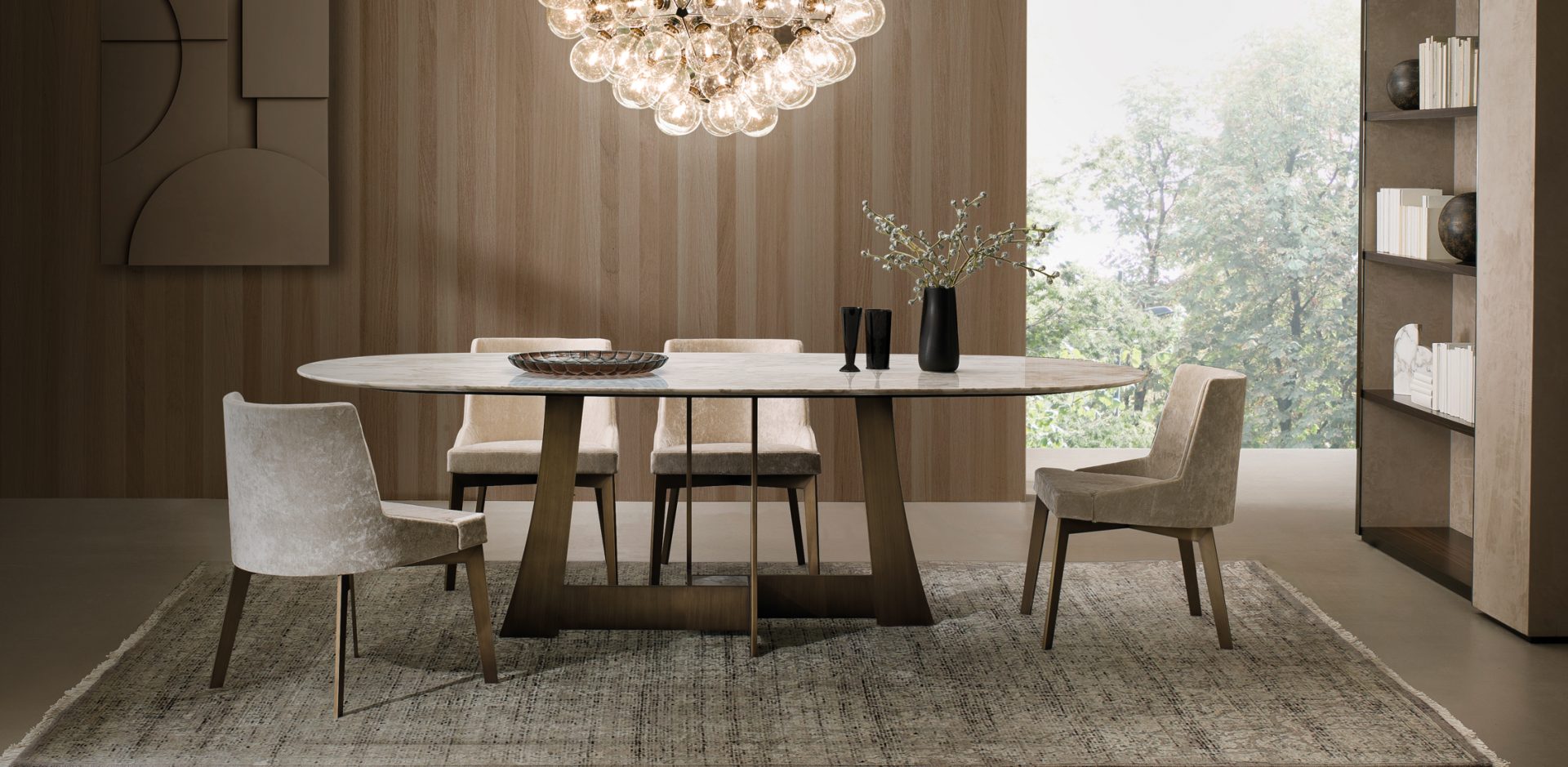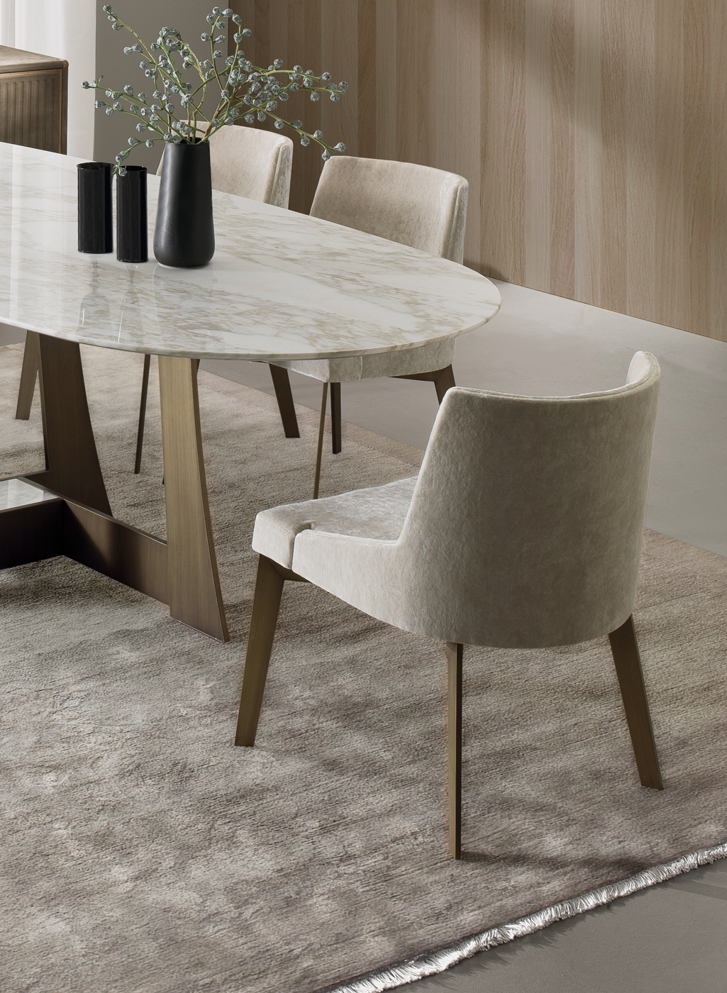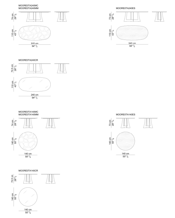 Moore — это коллекция, которая отдает дань столовым традициям, благодаря столу, металлическая конструкция которого напоминает форму японских самурайских мечей, а овальные и круглые столешницы выполнены из мрамора, стекла или дерева.