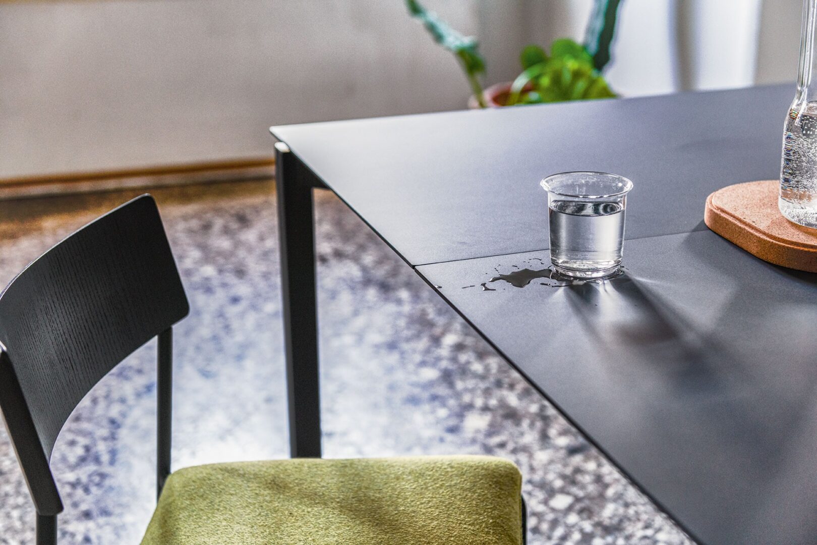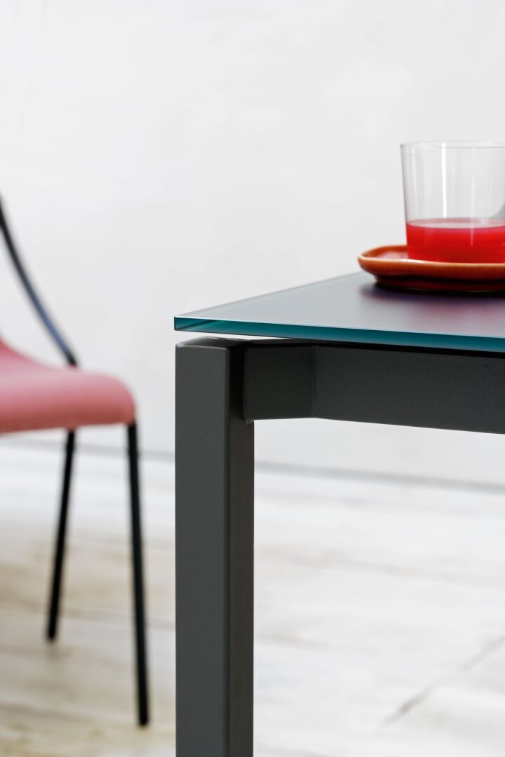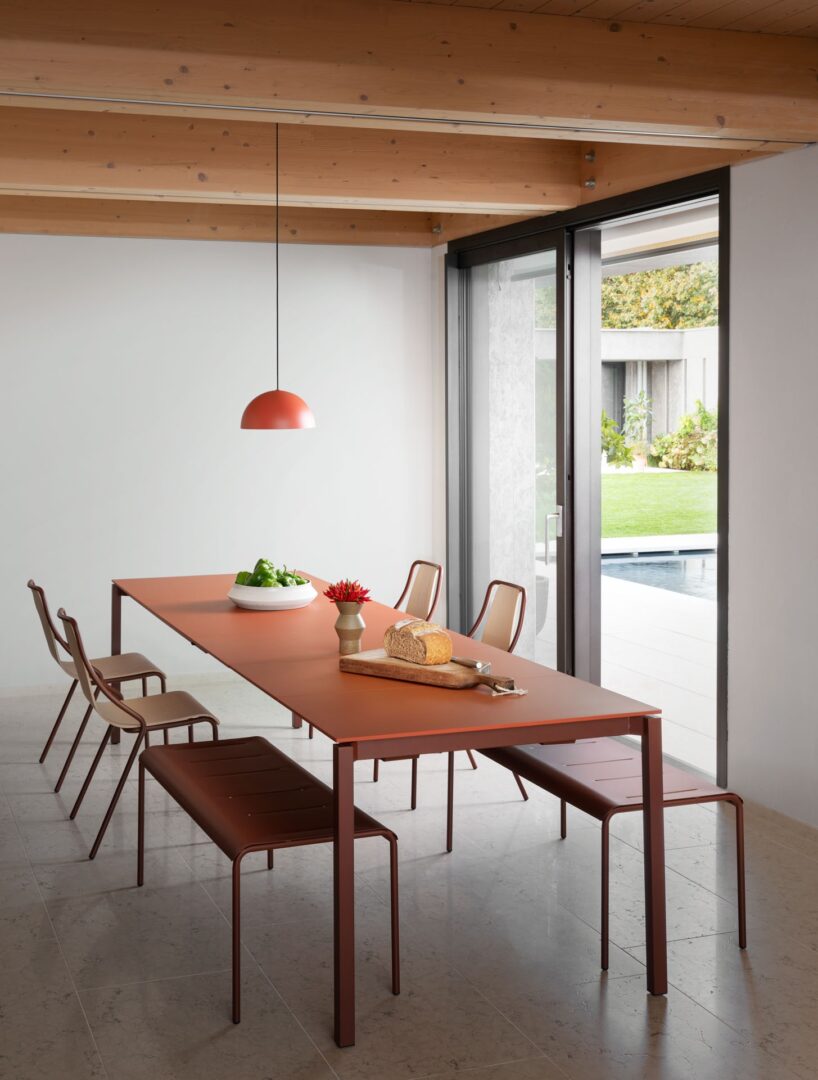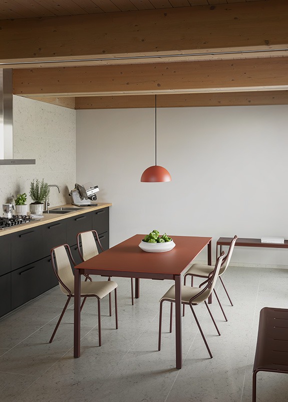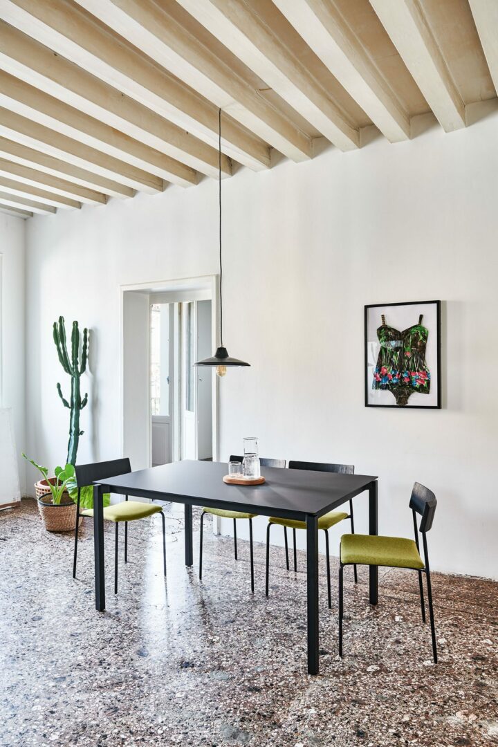 Деревянный стационарный стол на четырех ножках. Металлическая конструкция. Также доступна выдвижная версия.
