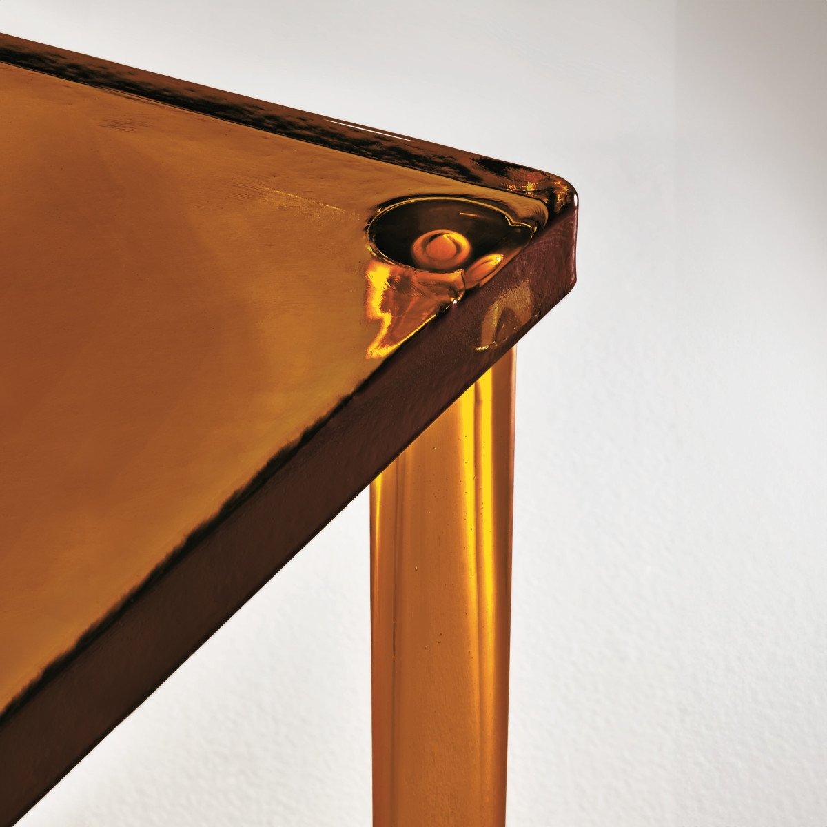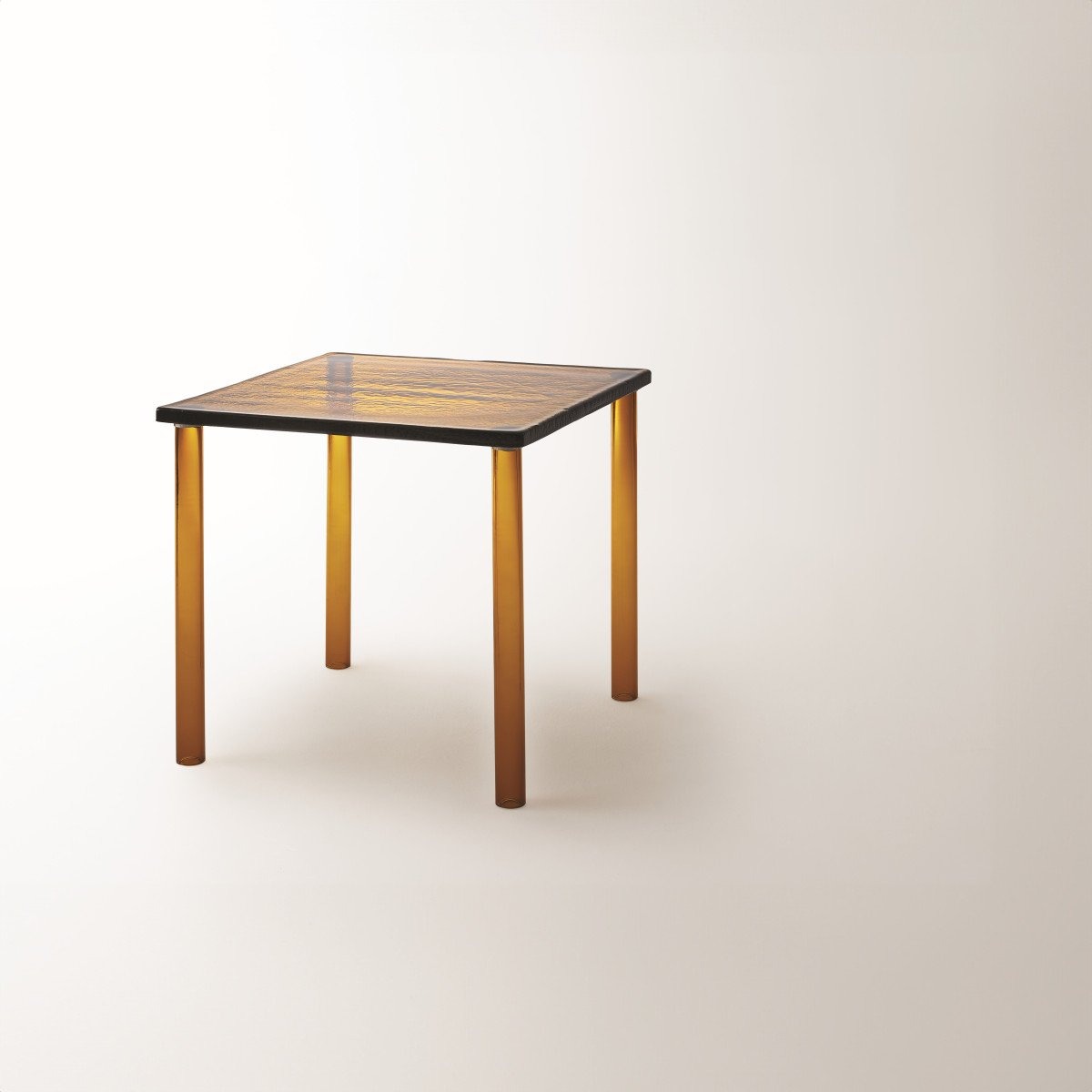 Высокие и низкие столики полностью изготовлены из муранского стекла, отличающегося необычайной прочностью и пластичностью материала. Квадратные столешницы изготовлены из очень толстого литого стекла, а цилиндрические ножки — из выдувного стекла. Доступны в янтарном или прозрачном исполнении. Ножки низкого стола приварены непосредственно к столешнице, в то время как ножки высокого стола прикреплены к столешнице пластинами из нержавеющей стали, привинченными друг к другу.