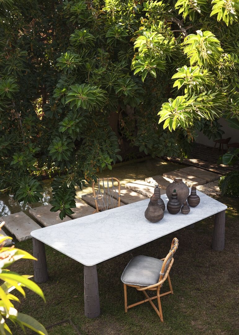 Экстерьерный стол Nevada авторства Паолы Навоне сочетает в себе лаконичный скульптурный дизайн со старинными техниками ручной обработки терракоты в традициях Тосканы. Основательные ножки стола категории Outdoor, выполненные из терракоты и напоминающие вылепленные вручную вазоны, отражают творческую фантазию, с которой опытные мастера создавали неповторимые творения, отмеченные оригинальной пористостью, отметинами и оттенками, обусловленными ручной отделкой. Большая столешница округлой и слегка неровной формы навевает ощущение тонкой, неподвластной времени элегантности; предлагается в исполнении из матового белого мрамора или эксклюзивного материала Palladiana, что обеспечивает долговечность и устойчивость к воздействию факторов, связанных с открытым пространством.