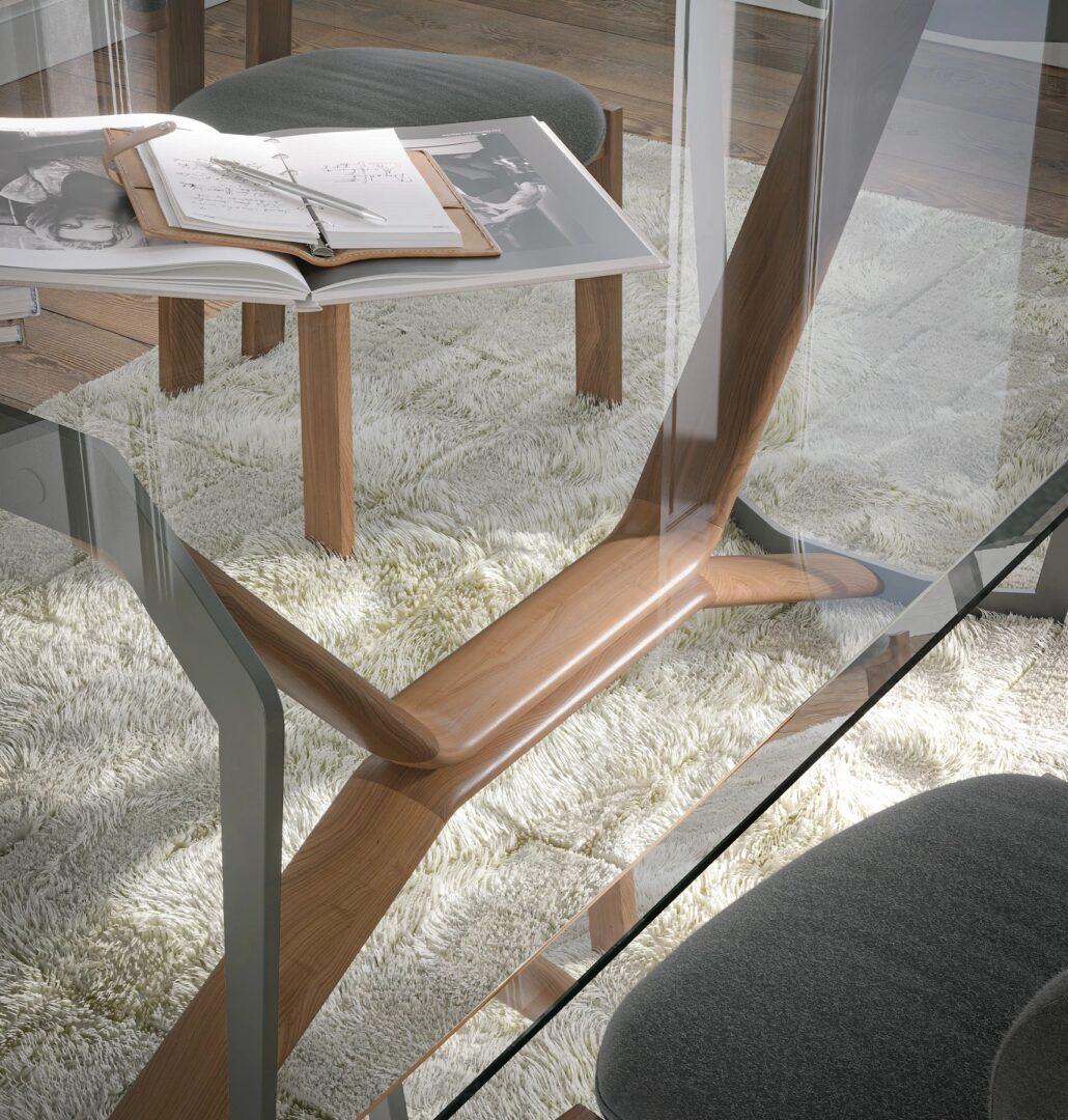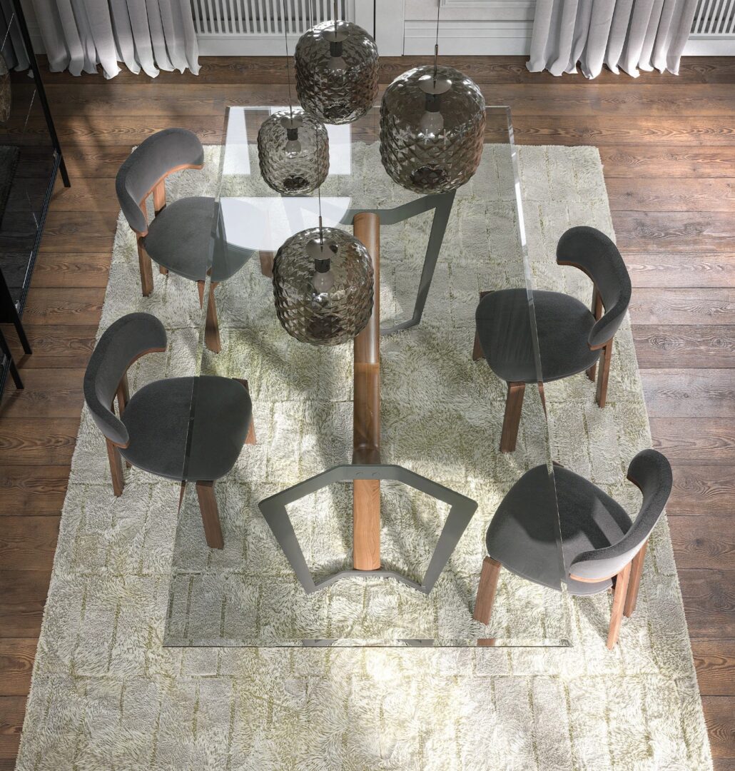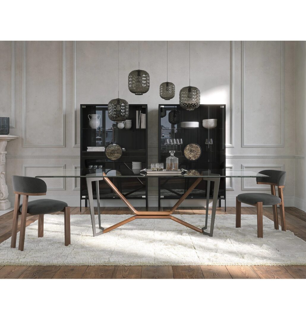 Стол Oliver представляет собой идеальное архитектурное сочетание материалов; основание, состоящее из окрашенного металла и массива дерева, поддерживает стеклянную или керамическую столешницу.