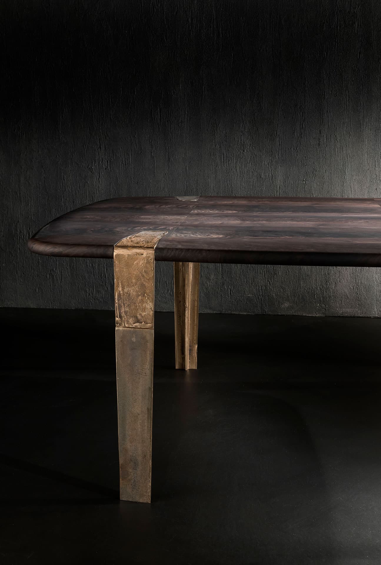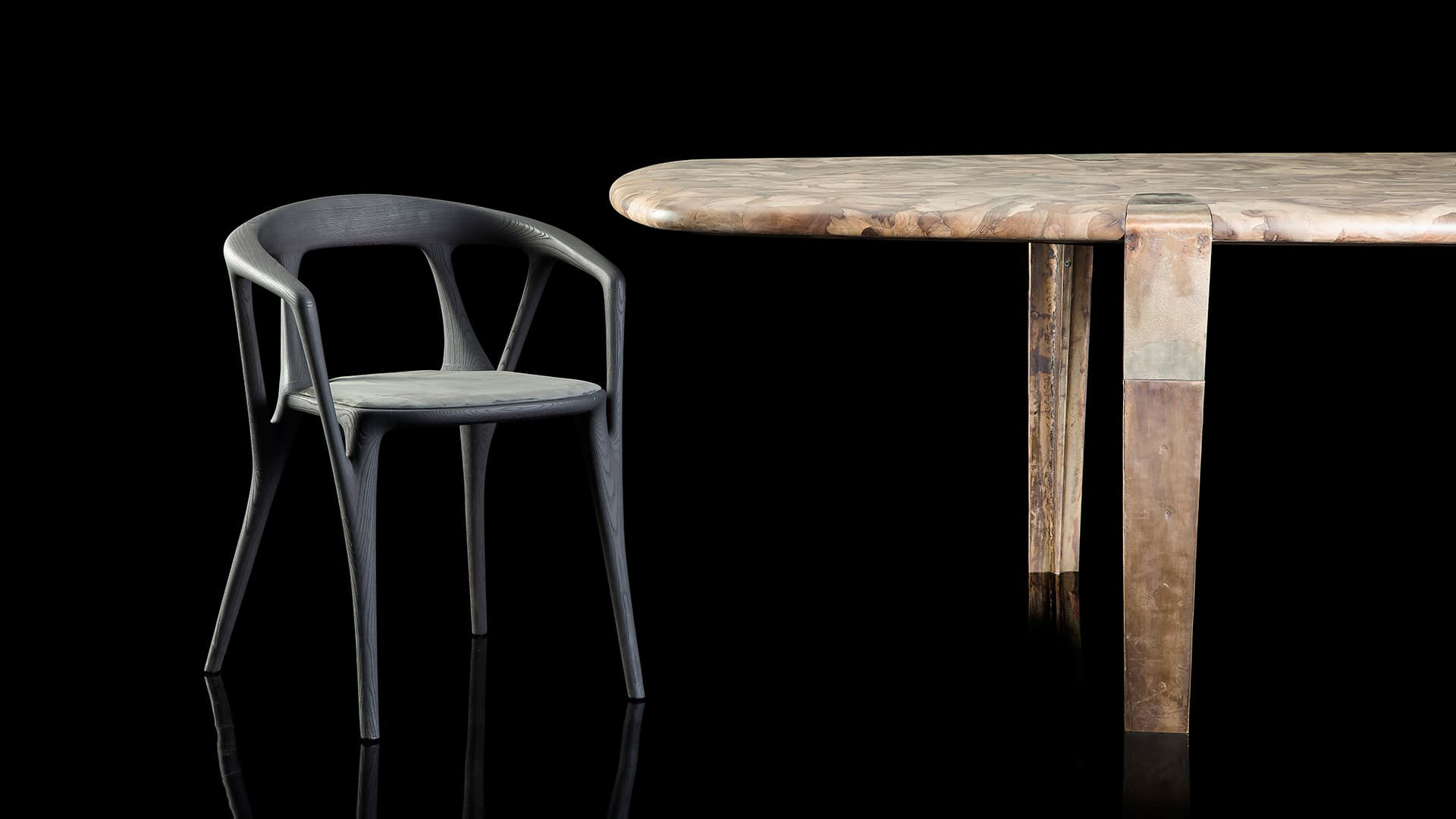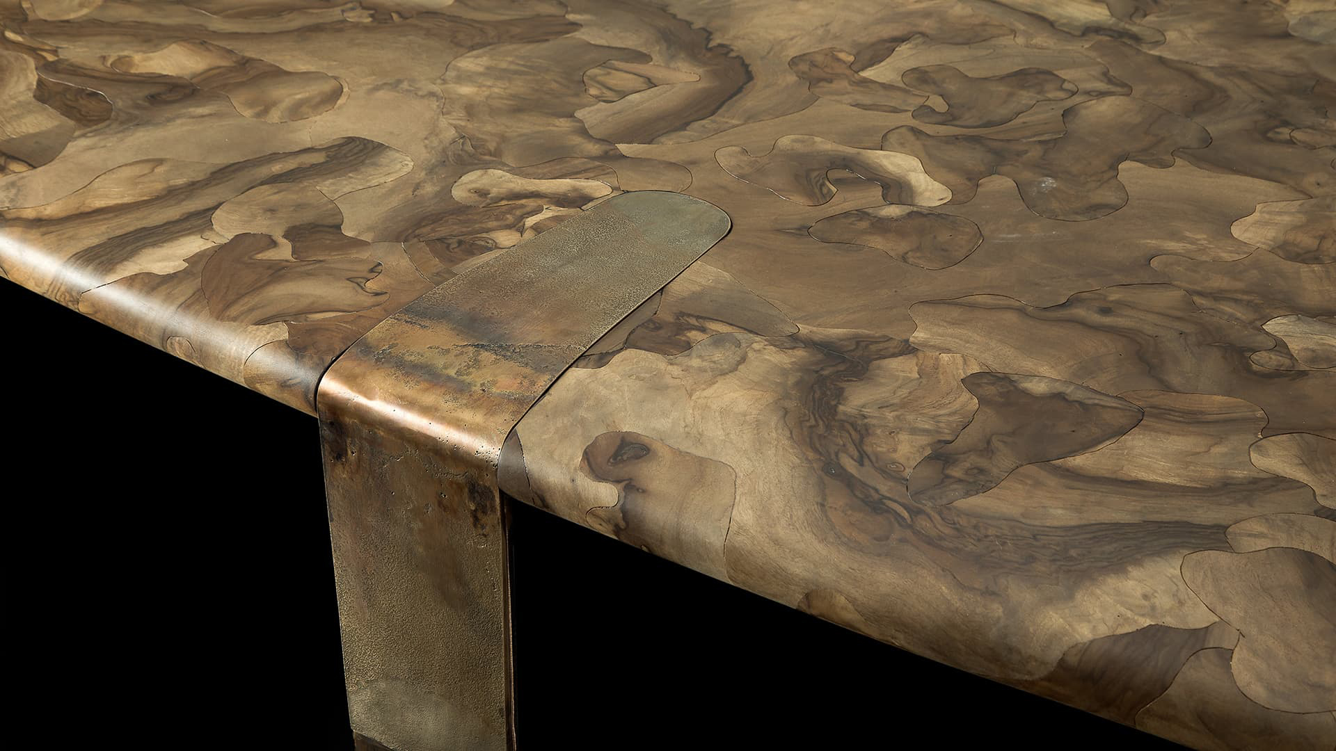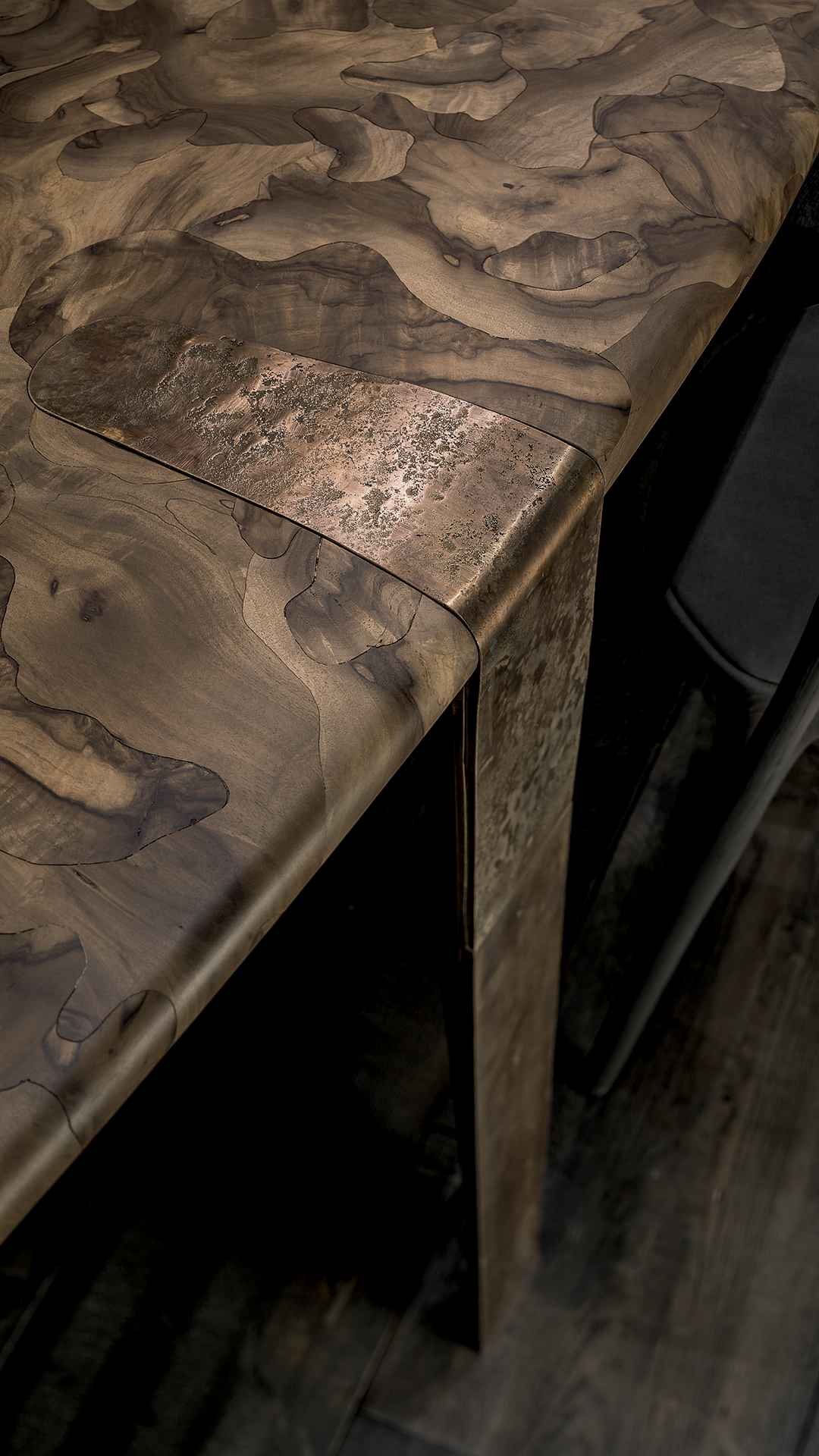 Новая интерпретация сложного, деликатного, почти забытого мастерского процесса определяет одно из самых знаковых произведений бренда — стол Oxymoron с интригующей столешницей из орехового дерева с микромозаичным узором, поддерживаемой тонкими бронзовыми ножками, отлитыми из песка.
