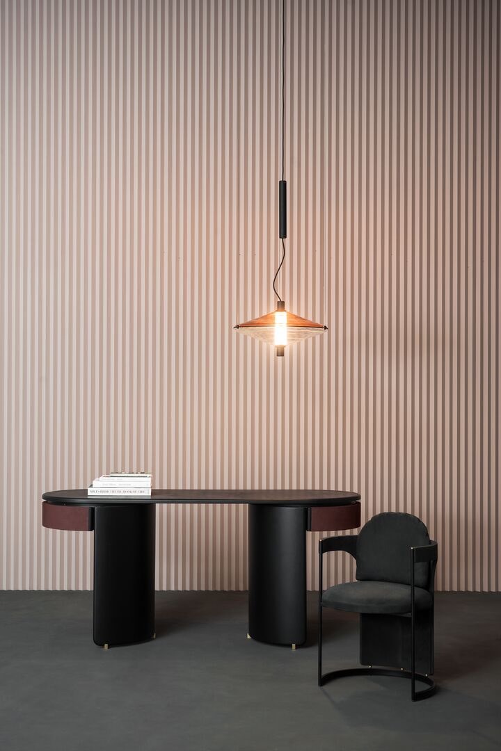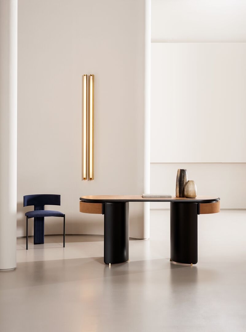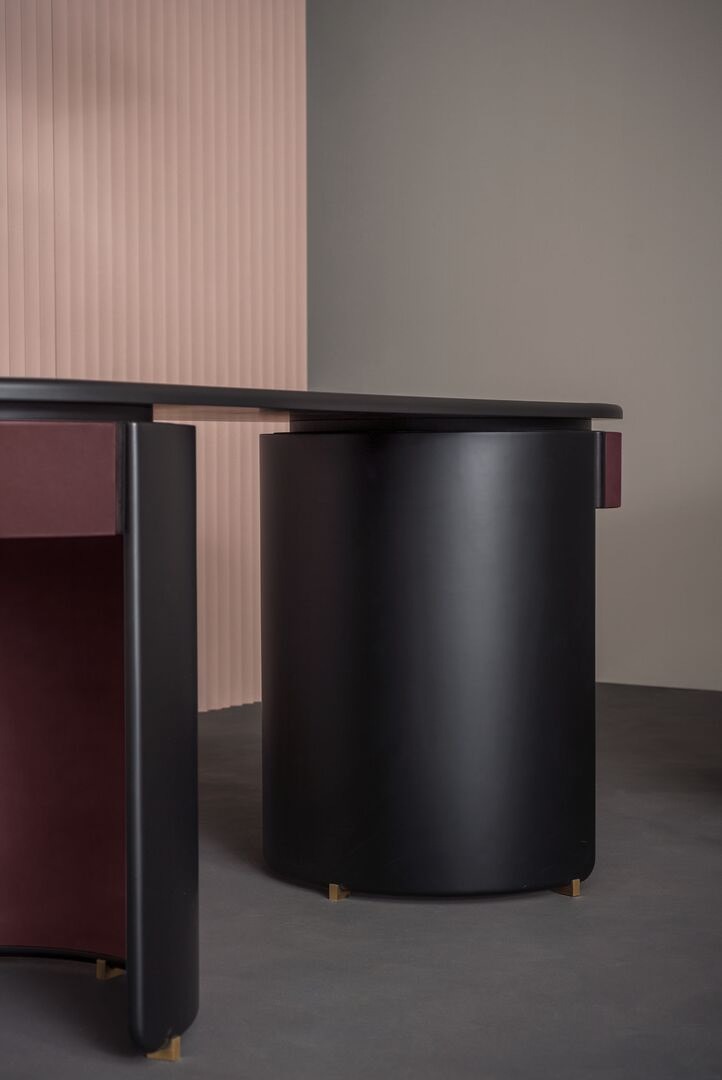 Как в версии консоли, так и в виде письменного стола, модель Parsec приносит в дом и кабинет элегантность и оригинальность дизайна Пьетро Руссо, представая в универсальной и изысканной форме. Символичная конструкция лаконичных округлых очертаний включает повернутые наружу U-образные ножки, которые обтянуты первоклассной кожей, покрывающей также и столешницу. В консоли более компактного линейного дизайна элементы хранения выполнены из стали, окрашенной порошковой краской матового черного цвета. Своеобразный характер столу придают функциональные элементы хранения в форме поворотных круглых ящиков, которые можно выдвигать или ставить на место по своему усмотрению.